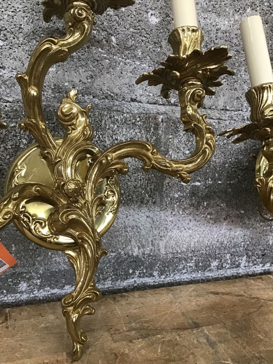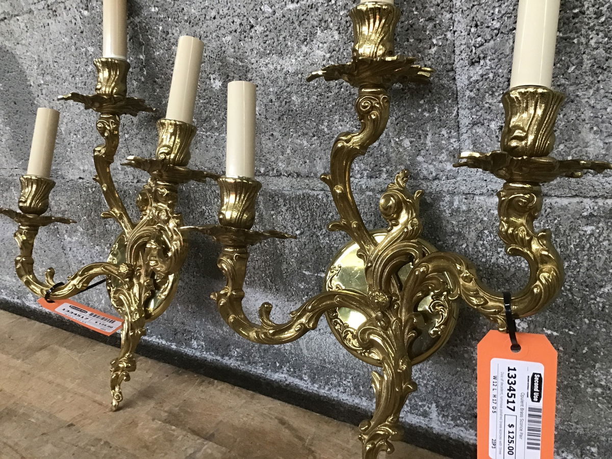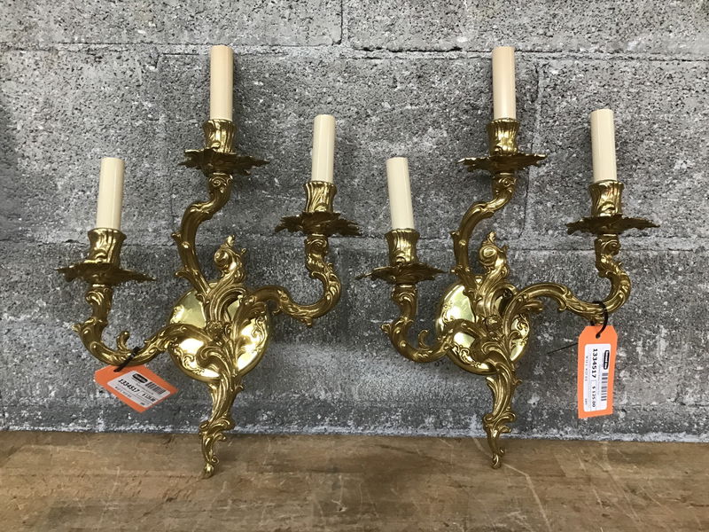 Duo of decadent, luminous polished brass sconces with three tiered candelabra arms. They have a sort of twisting tree vibe to them that feels like it could fit well in a cabin that needs some pizzaz. These are a modern reproduction made from cast brass. Suitable for dry locations only.