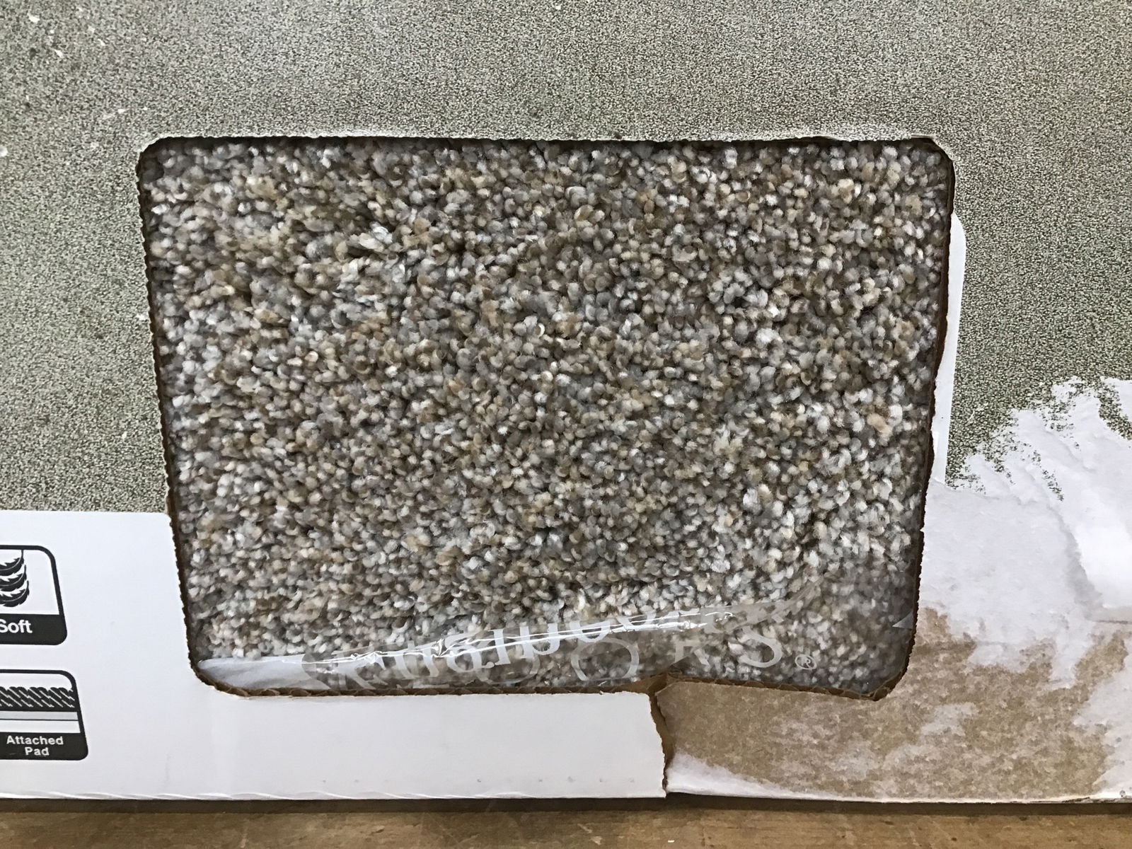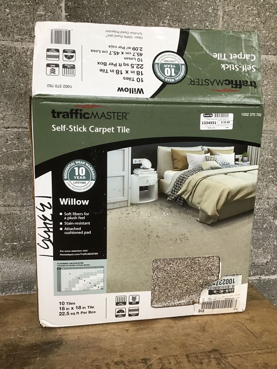 Full, ten piece box of Traffic Master 'Willow' peel n' stick carpet tiles, brand new and ready to go!