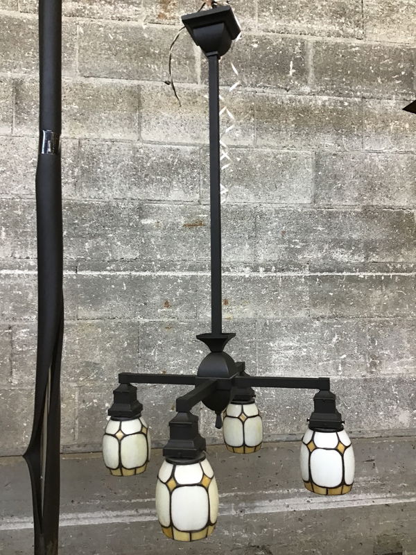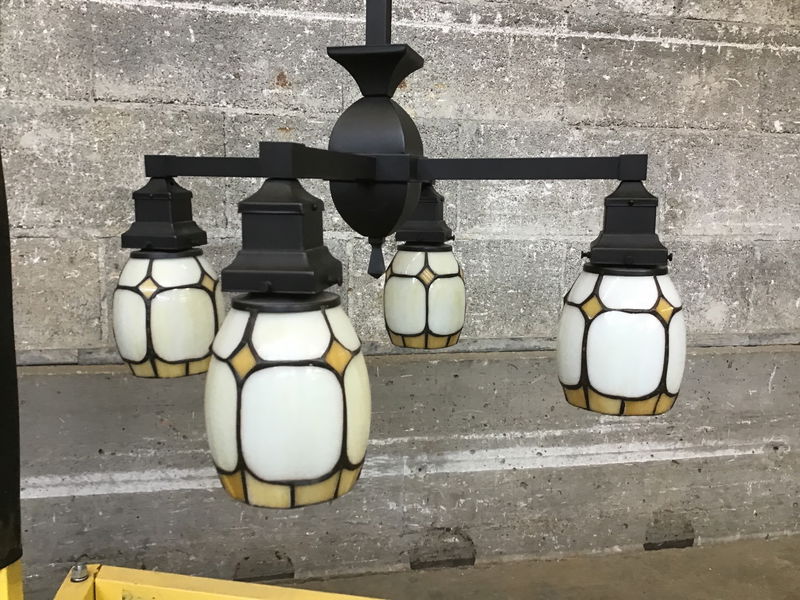 This stately Rejuvenation ceiling light from 2007 features four opaque slag glass shades, a modern matte black frame and is suitable for dry locations only. This gem is ready to be installed into an entryway with high ceilings for a home that appreciates unassuming sophistication.