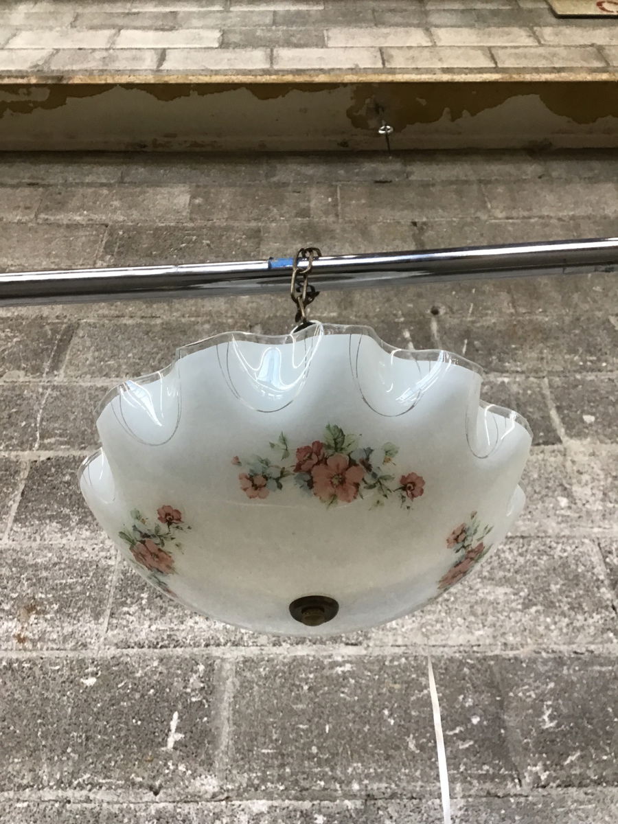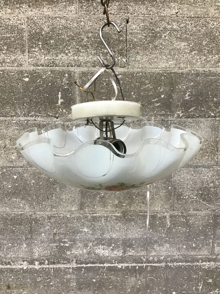 Beautiful, two-bulb, semi-flush ceiling light with scalloped glass shade and pleasant flower motif.