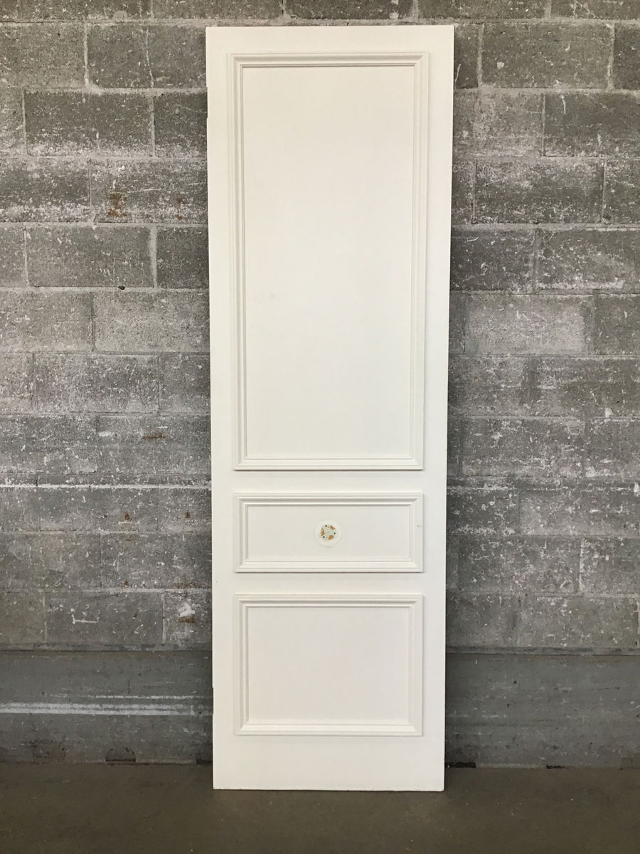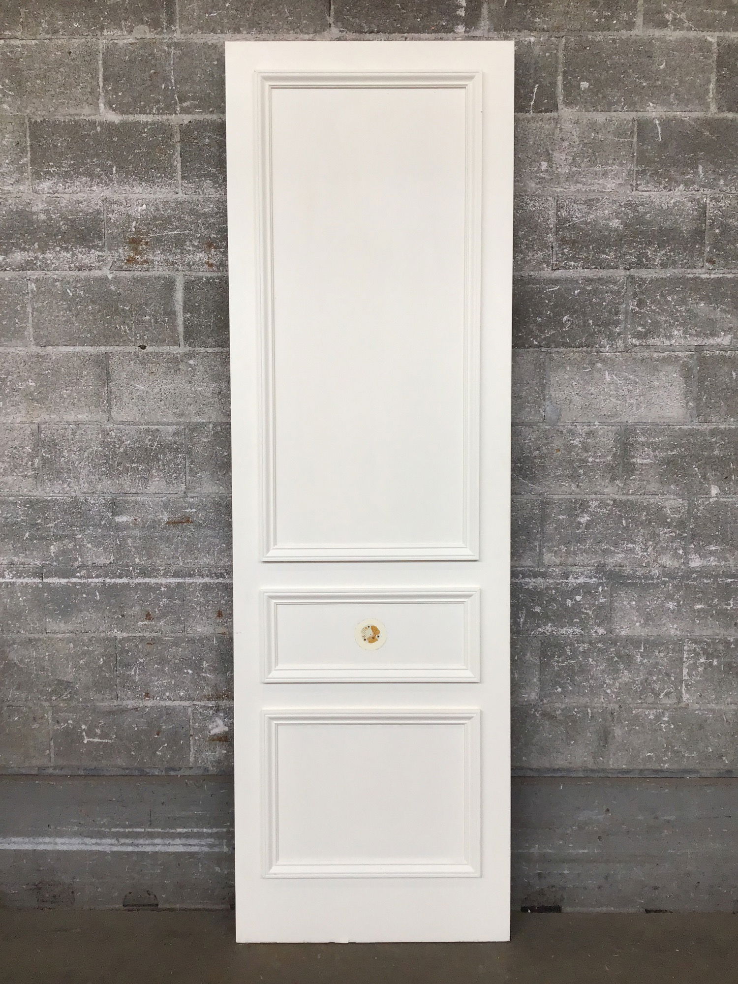 Extra tall, hollow core interior door with trim installed to create faux panels. Had dummy knobs on either side in kind of an oddball spot given where the trim sits.