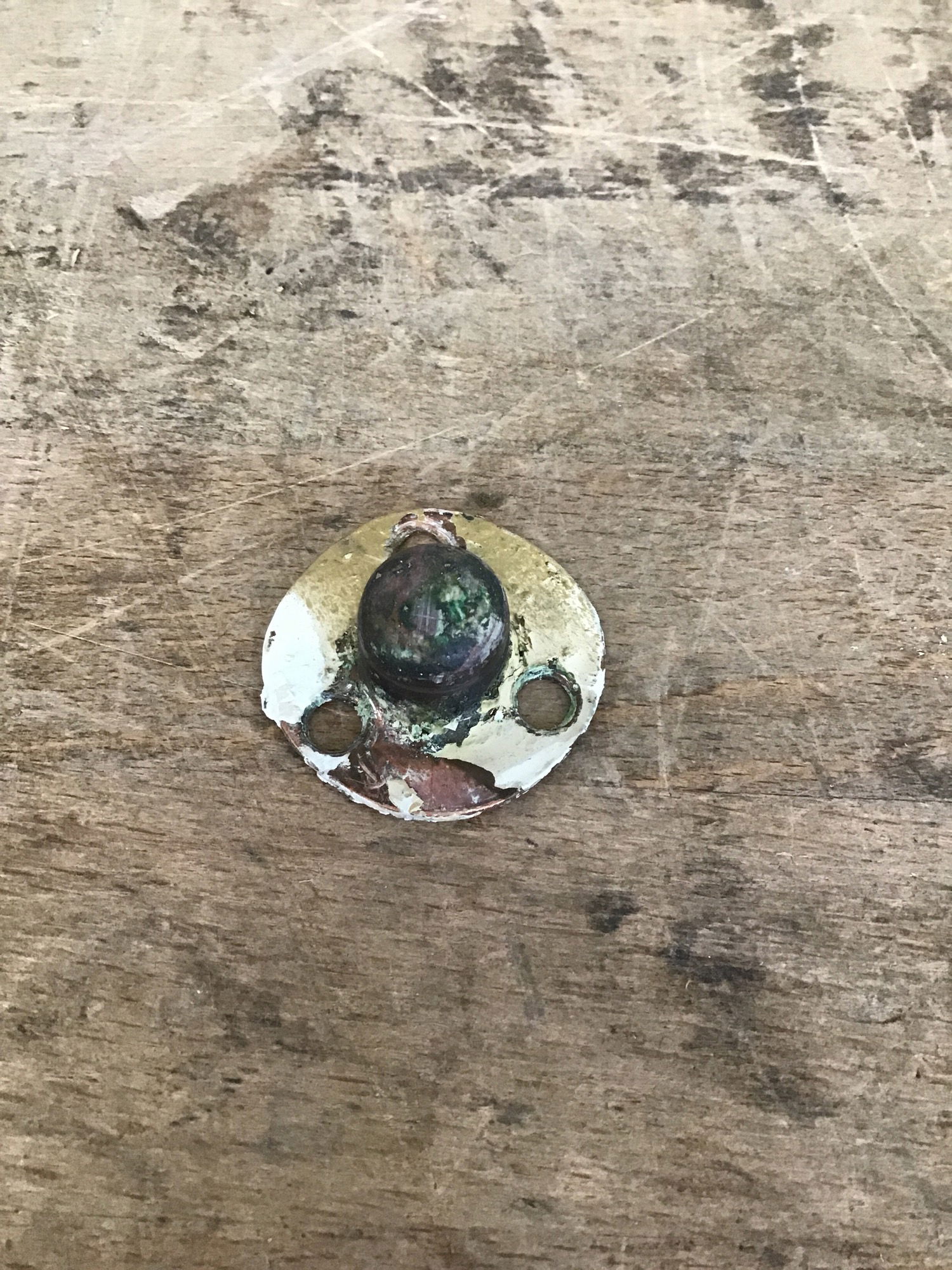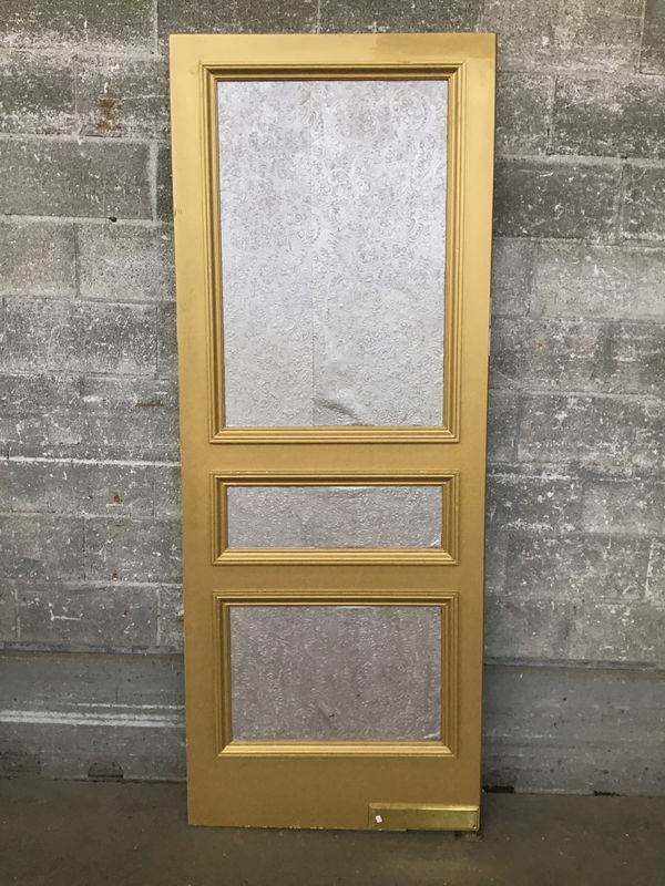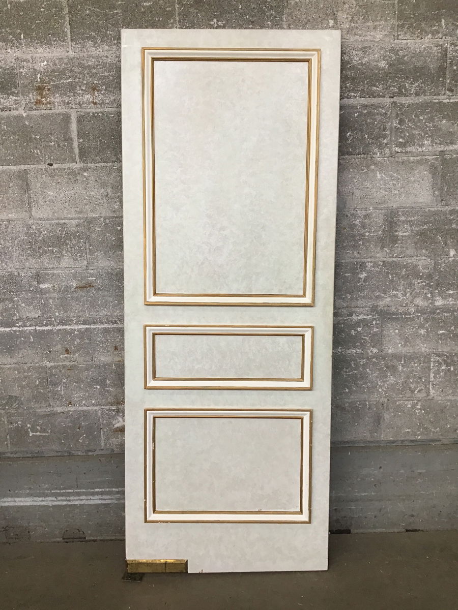 Hollow core butler door with trim installed to create faux panels. Has a delicate paint job on one side meant to resemble marbled wallpaper, and the other has darker textured paper in the faux panels. Includes hardware for install.