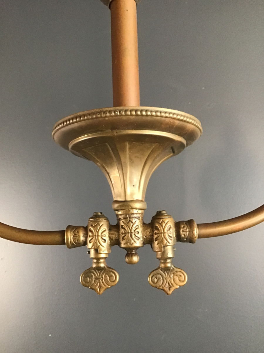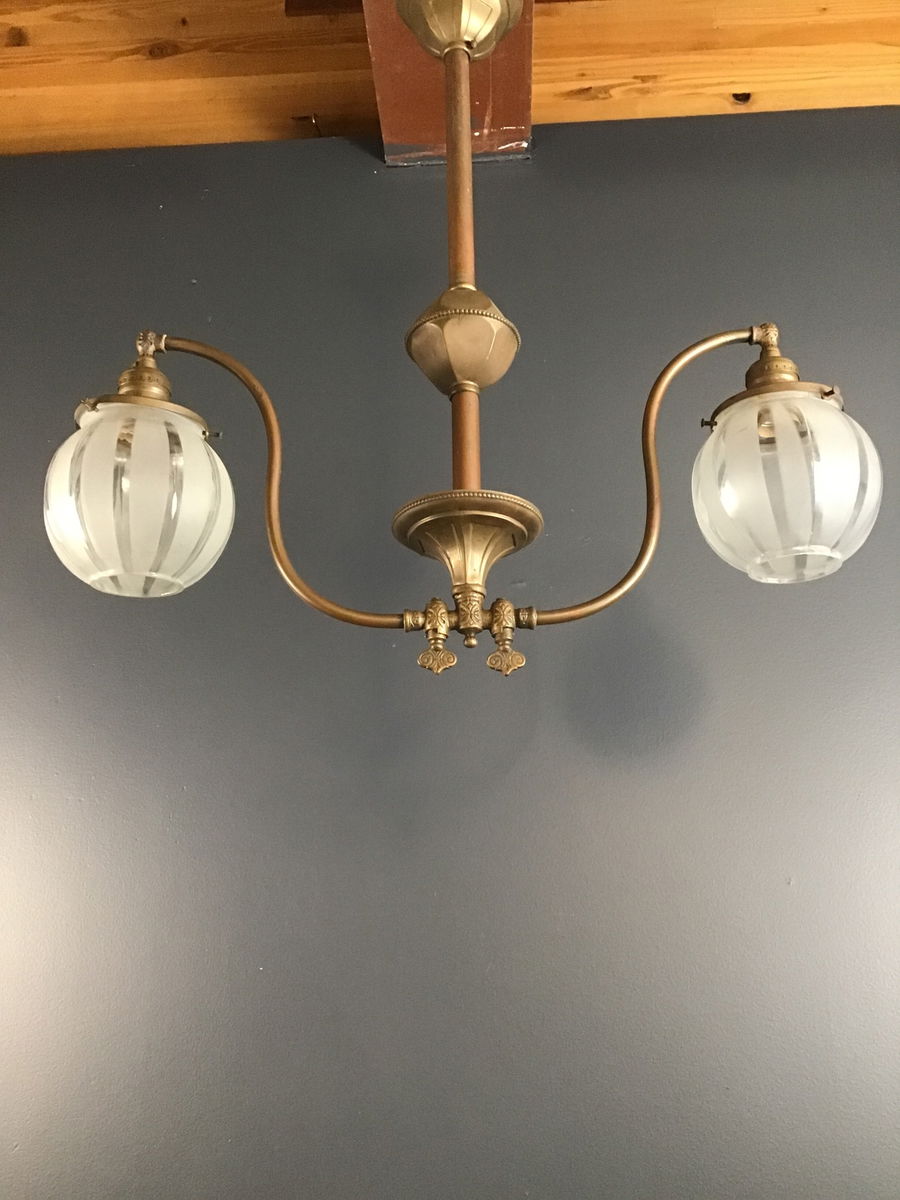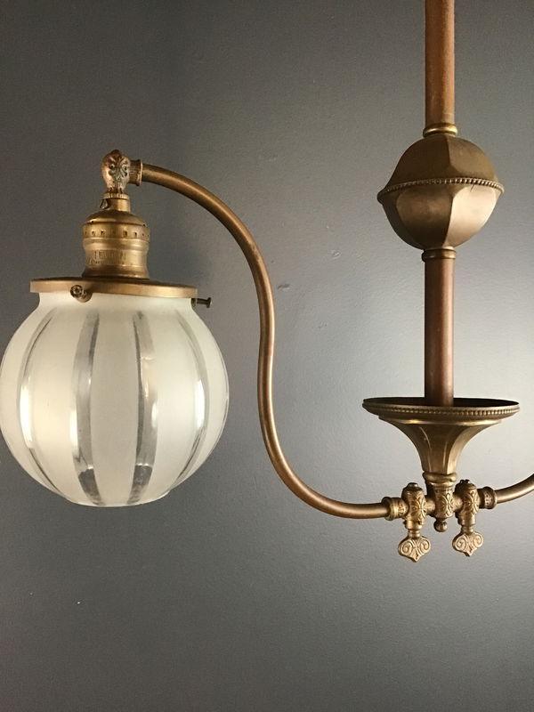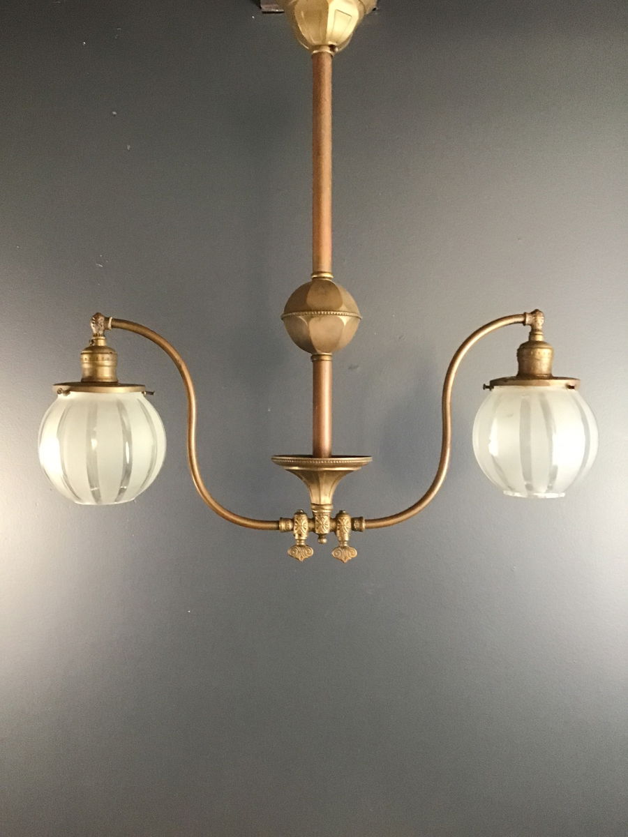 A gorgeous Edwardian dual arm gas light that has been converted to electric. Comes with two orb shades that compliment the design of the copper fixture. Rewired in our on site light repair workshop