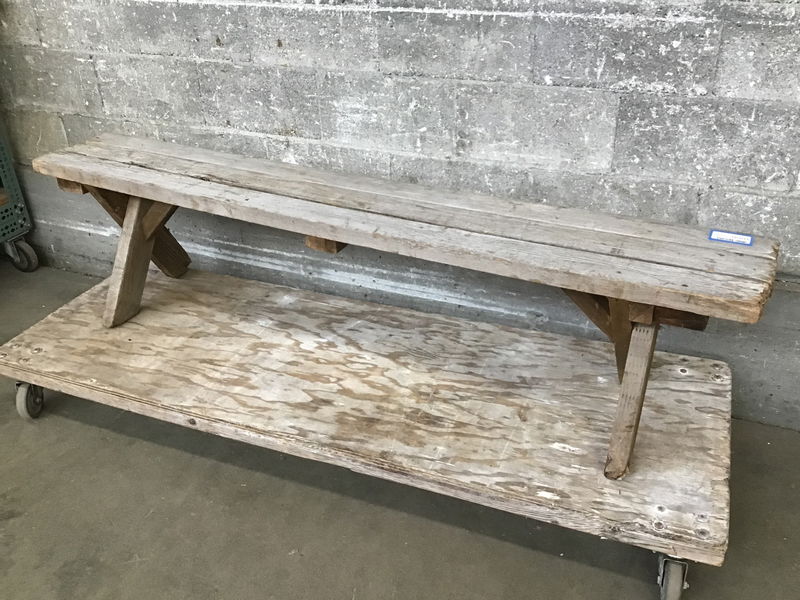 Rustic and weathered wooden garden bench with plenty of character! Legs are a little wobbly from a couple seasons' worth of water, but still sturdy and fit for a new yard to sit in.