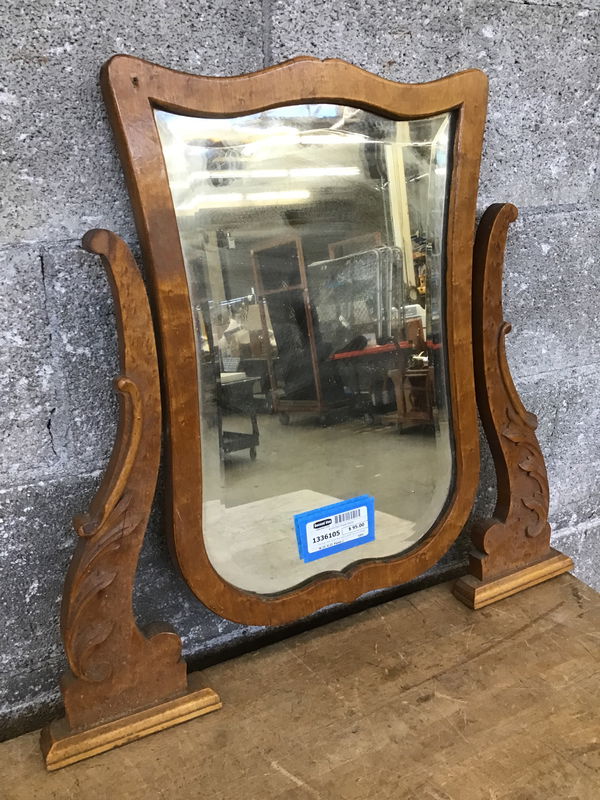 This is an older mirror that used to attach to an old dresser or vanity but now it has been orphaned. The frame is made from beautiful bird's eye maple.