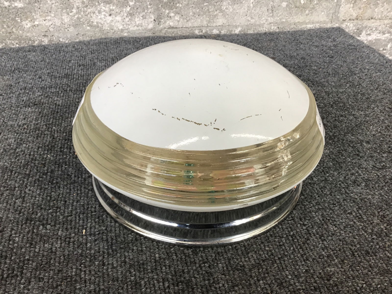 Flush mount light with chrome fitter and a fluted clear and white glass shade.