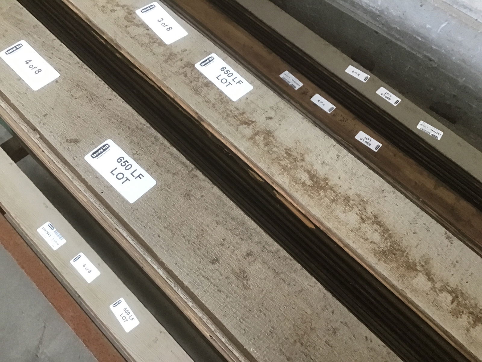 650 Linear foot lot of reclaimed clear cedar paneling that's been painted on the rough side and has an unfinished smooth side with a little tar paper residue here and there. It was not removed nicely, as there are plenty of missing back sides of grooves, so I'm not sure you'd want to reinstall as paneling, BUT if you wanted to clean this up a bit with a thickness planer and maybe rip off the tongues and/or grooves, you'd have some FINE looking clear cedar to use. Lengths range from 5' to 12', most in the 8' to 11' range. There are eight bundles making up the lot.