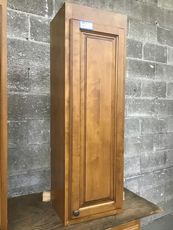 Medium dark stained, raised panel birch (I believe) wall cabinet. This one has a finished left side.