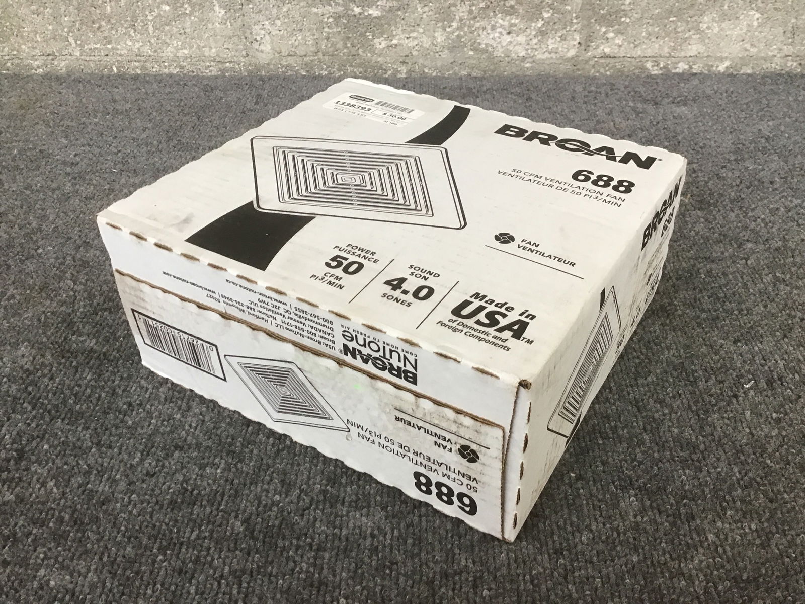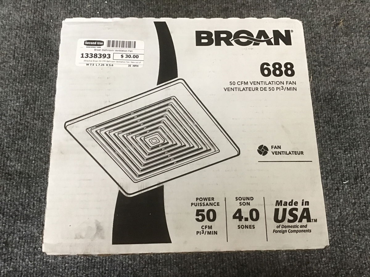 Attractive Broan 50 CFM Bathroom Ventilation Fan. New out of the box, never used. Model #688. Fits in 2" x 4" ceiling/wall construction. UL listed for use of over shower or bathtub with GCFI protected branch circuit. 3" duct connector size. Grille dimensions: 9.25" x 9" Photo may be representational.