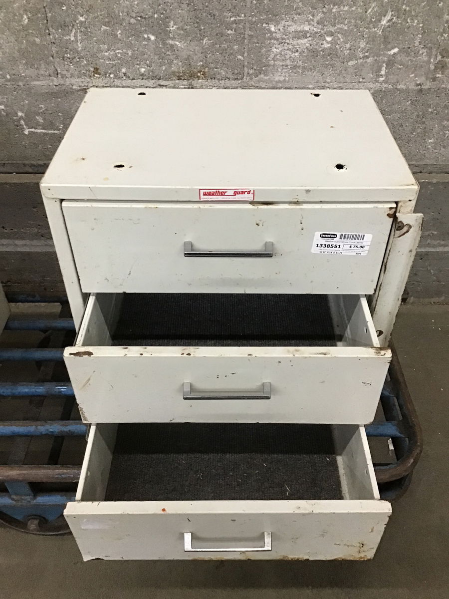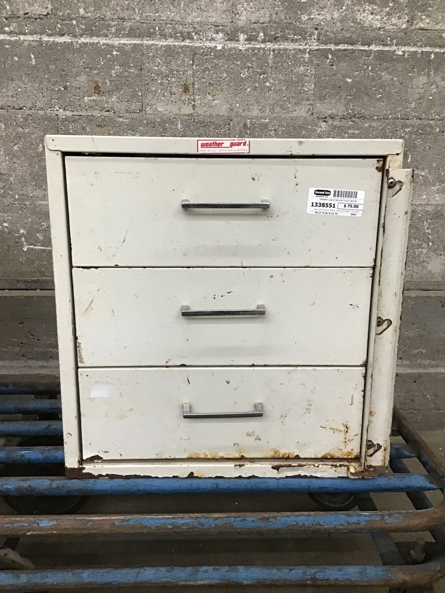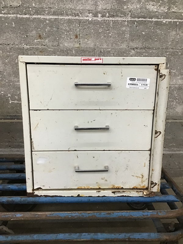Used, but functional Weather Guard brand parts or tool cabinet for your bench top or service van/truck. The paint is starting to flake or get pushed off by some rust. Price reflects condition. This one has its slide over lock to keep the drawers from opening.