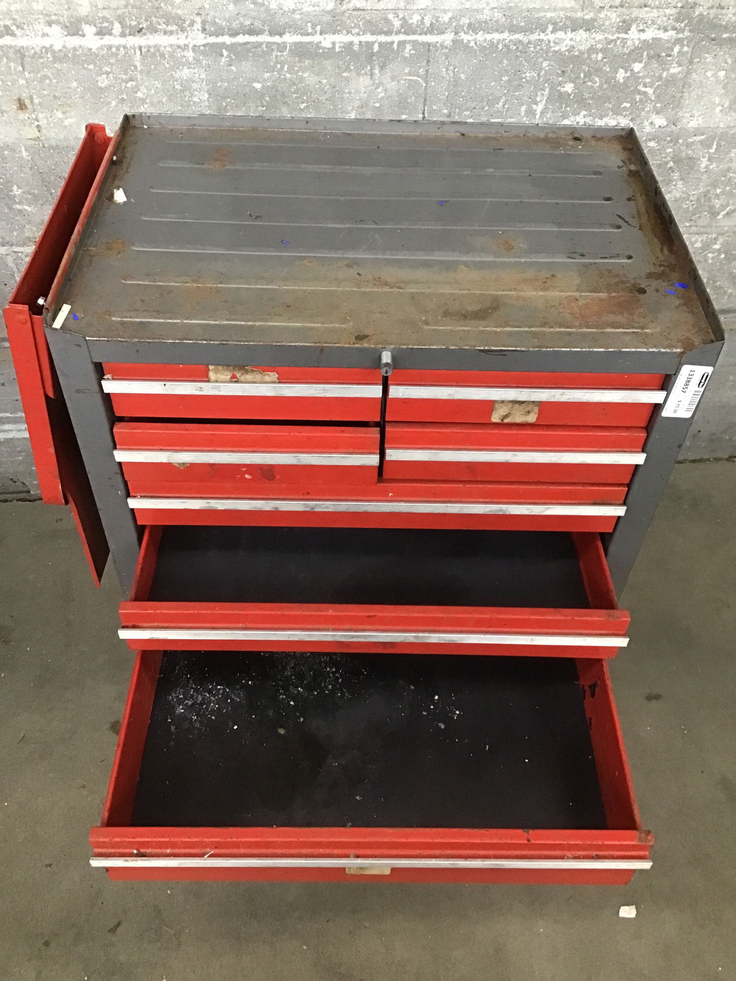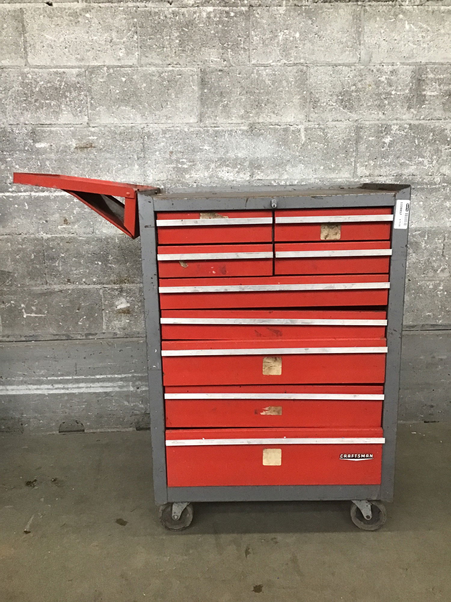 Functioning and rolling vintage Craftsman shop cabinet. All the drawers open without too much trouble, has a tumbler but no key. Also includes a handy flip up side table extension for when your project needs more room, it adds another 12" of surface.