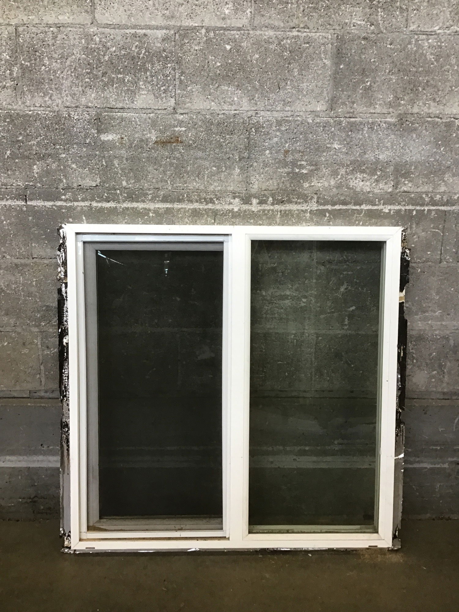 A vinyl slider window that looks to be in good shape.