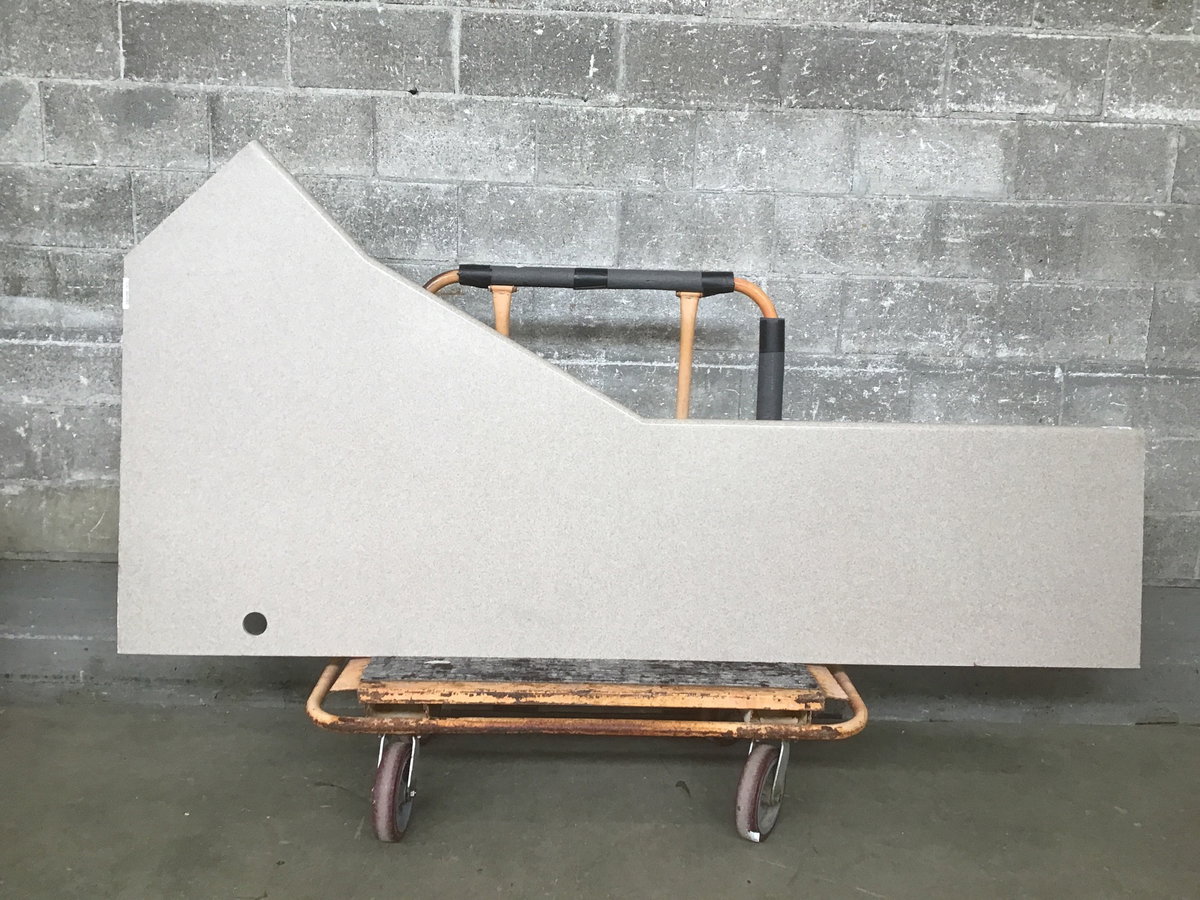 A length of brownish corian countertop that looks like it was made to fit a corner, with one finished edge and a hole sawed through in the corner. At its most shallow, this piece is 22-1/4" deep.