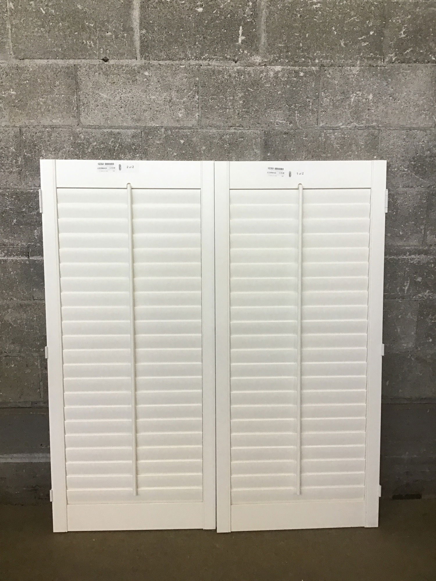 A pair of interior-grade window shutters with louvers (and an opener) and a white paint job.
