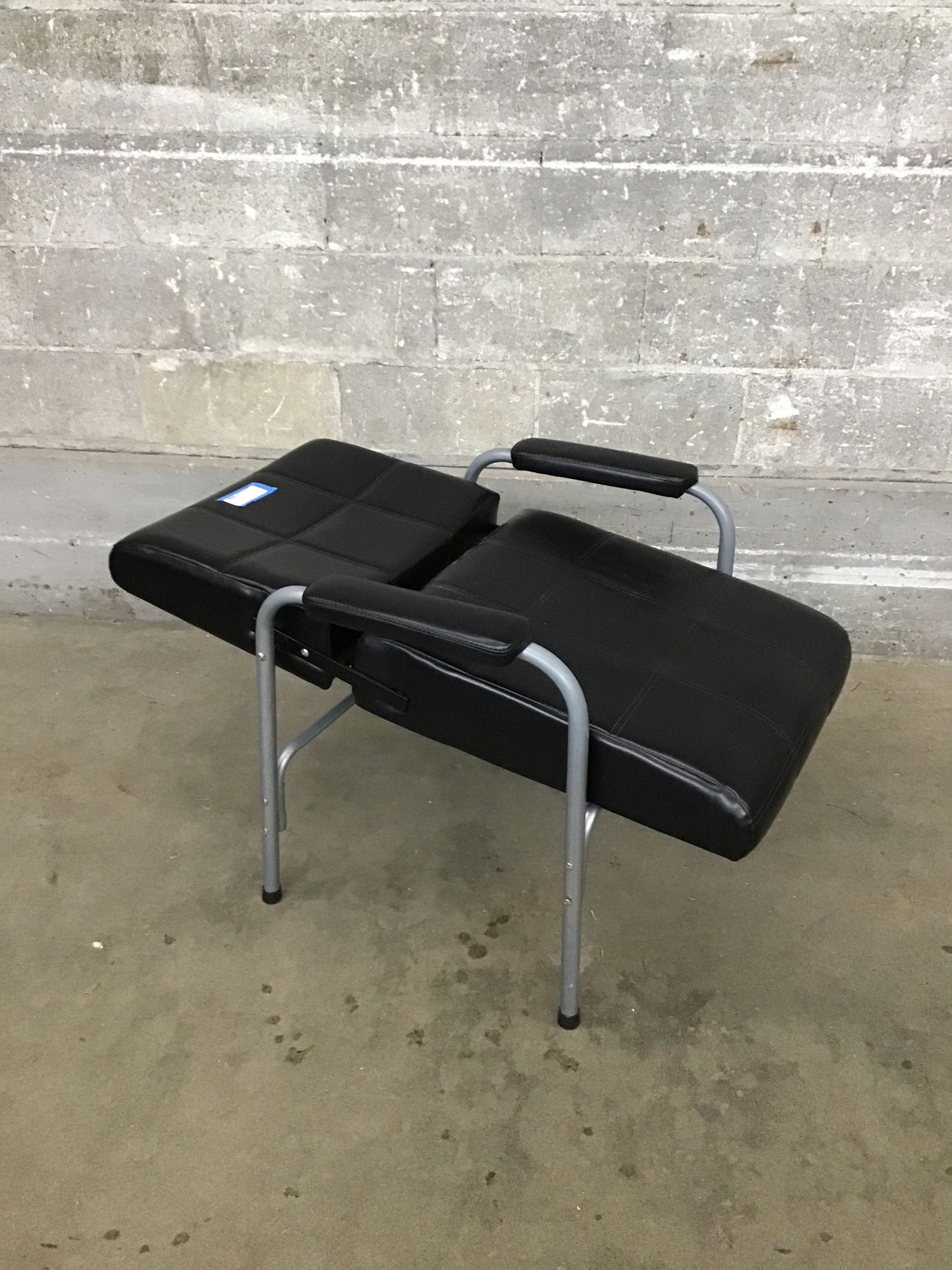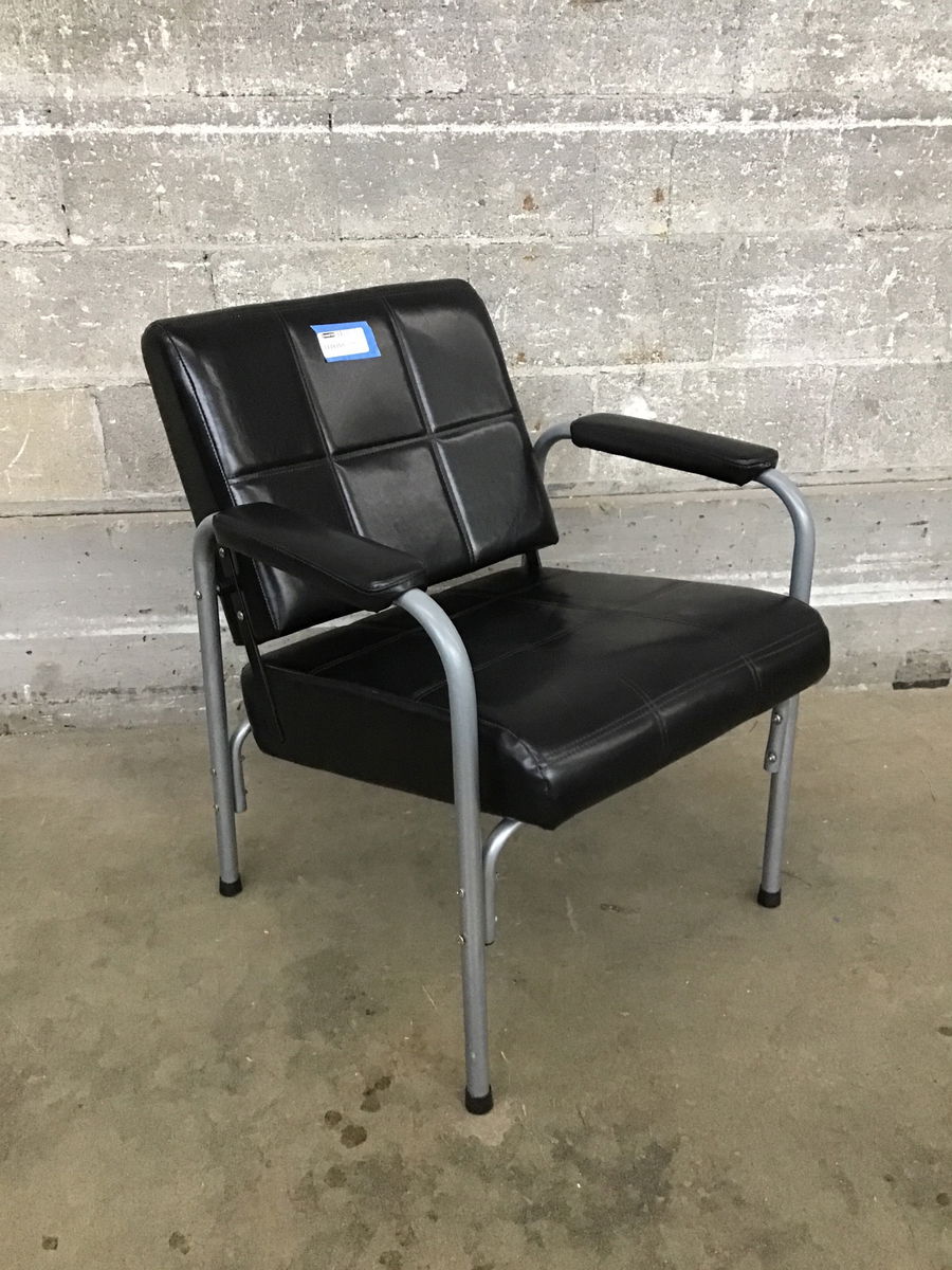 A chair with faux-leather upholstery whose back and seat slide and swing so that you can lean back as far as you want, up until you're just lying down. It's a bit small for a futon, but who am I to judge?