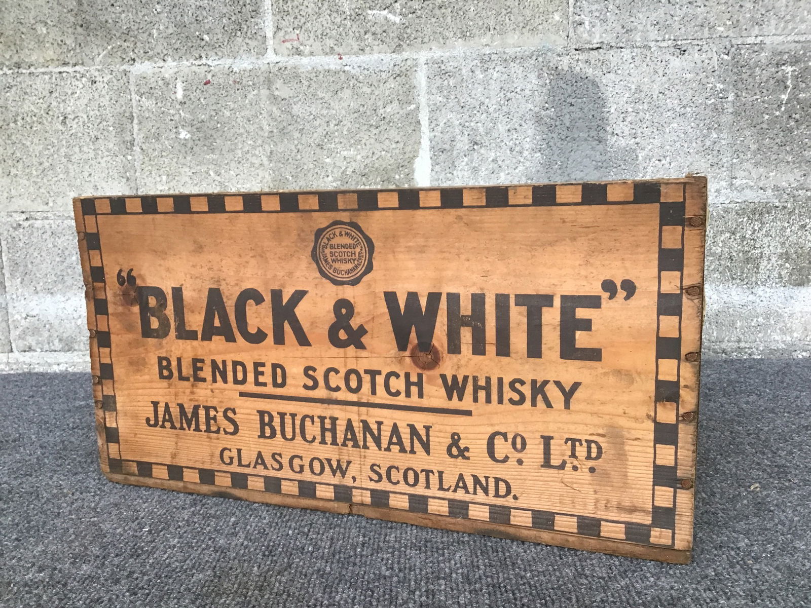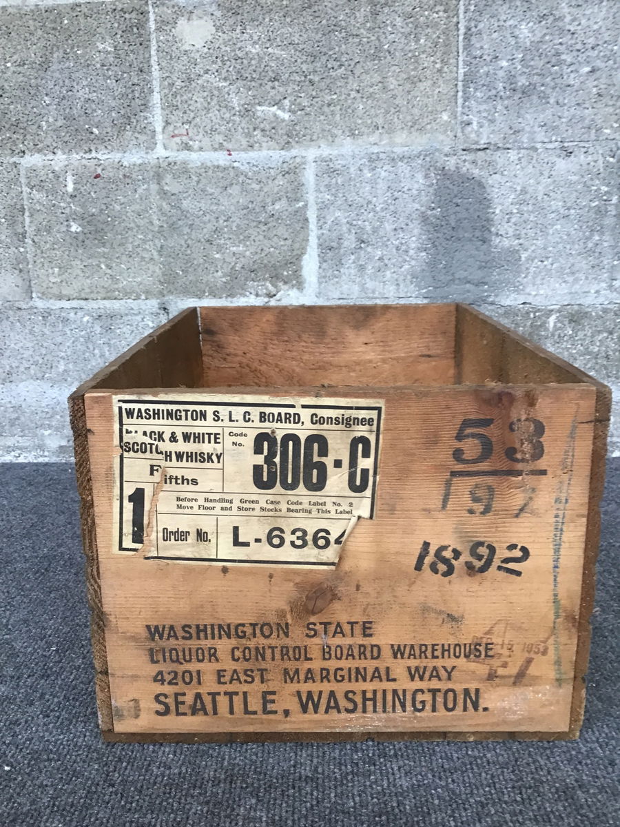 Vintage wooden crate that was once used to transport Black & White scotch whiskey. It's a little dusty, but the crate is in good shape and the lettering is all still easily legible.