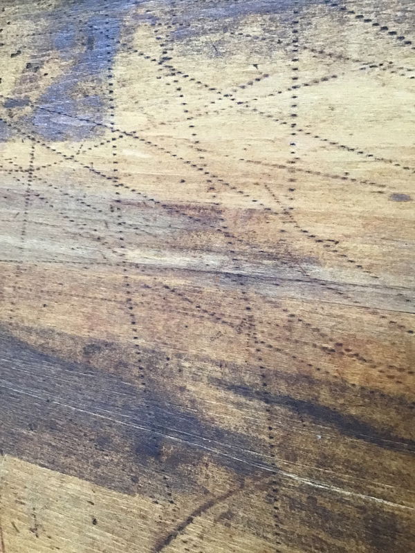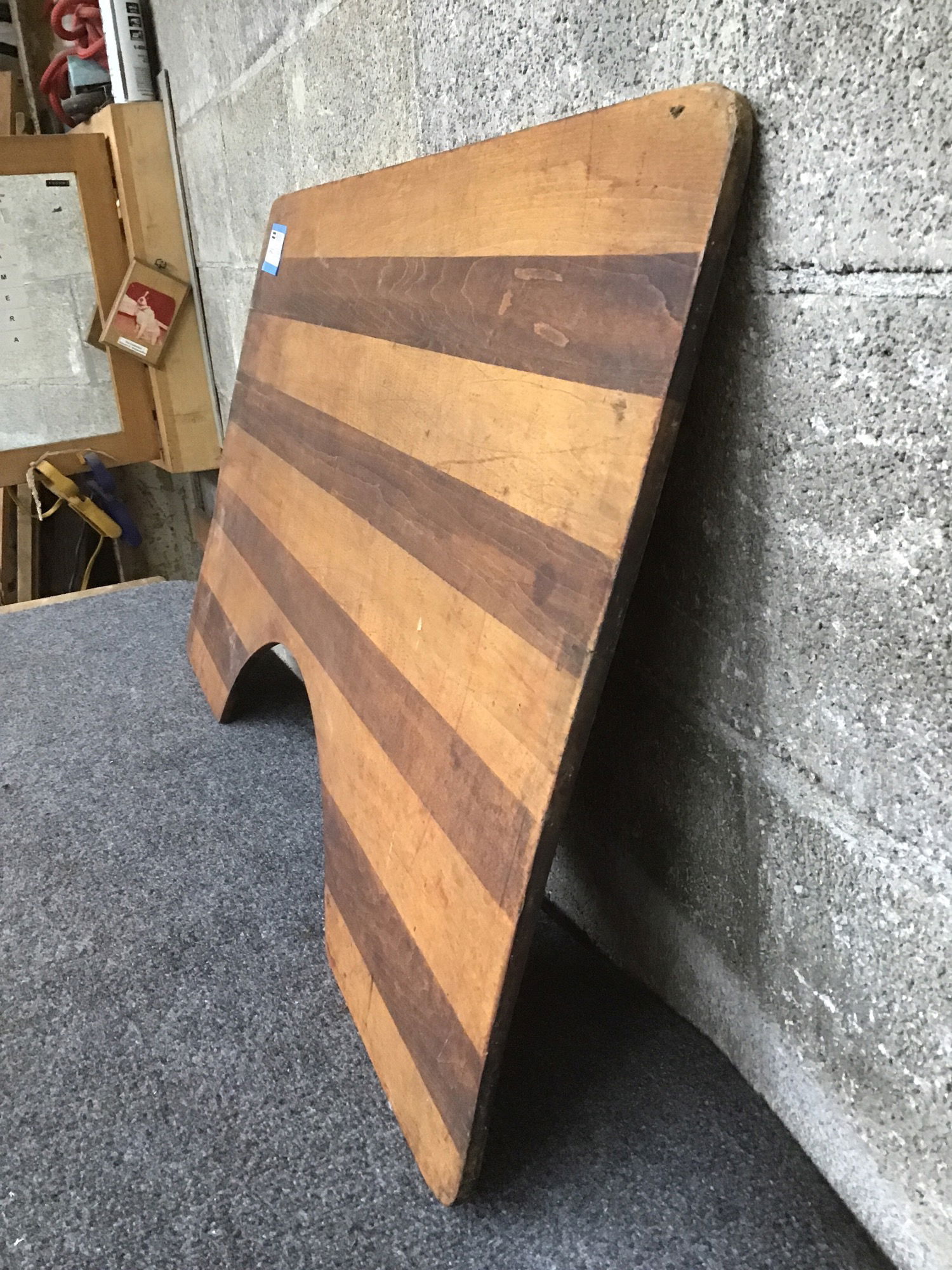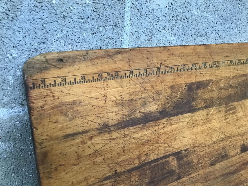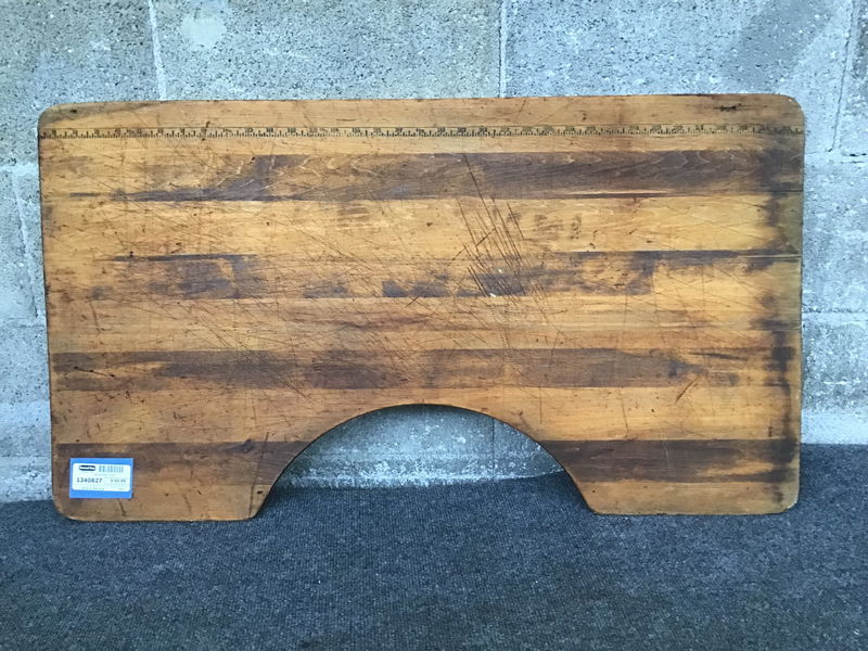This once flat board with arc to fit around your lap and ruler across the top was once used to cut out sewing patterns (as seen by the "tracks" of the pattern cutter that run across both surfaces. Has a bit of a "wave"/warp to it at this point, but great patina. Fairly light weight, but looks to be made out of two types of hardwood.
