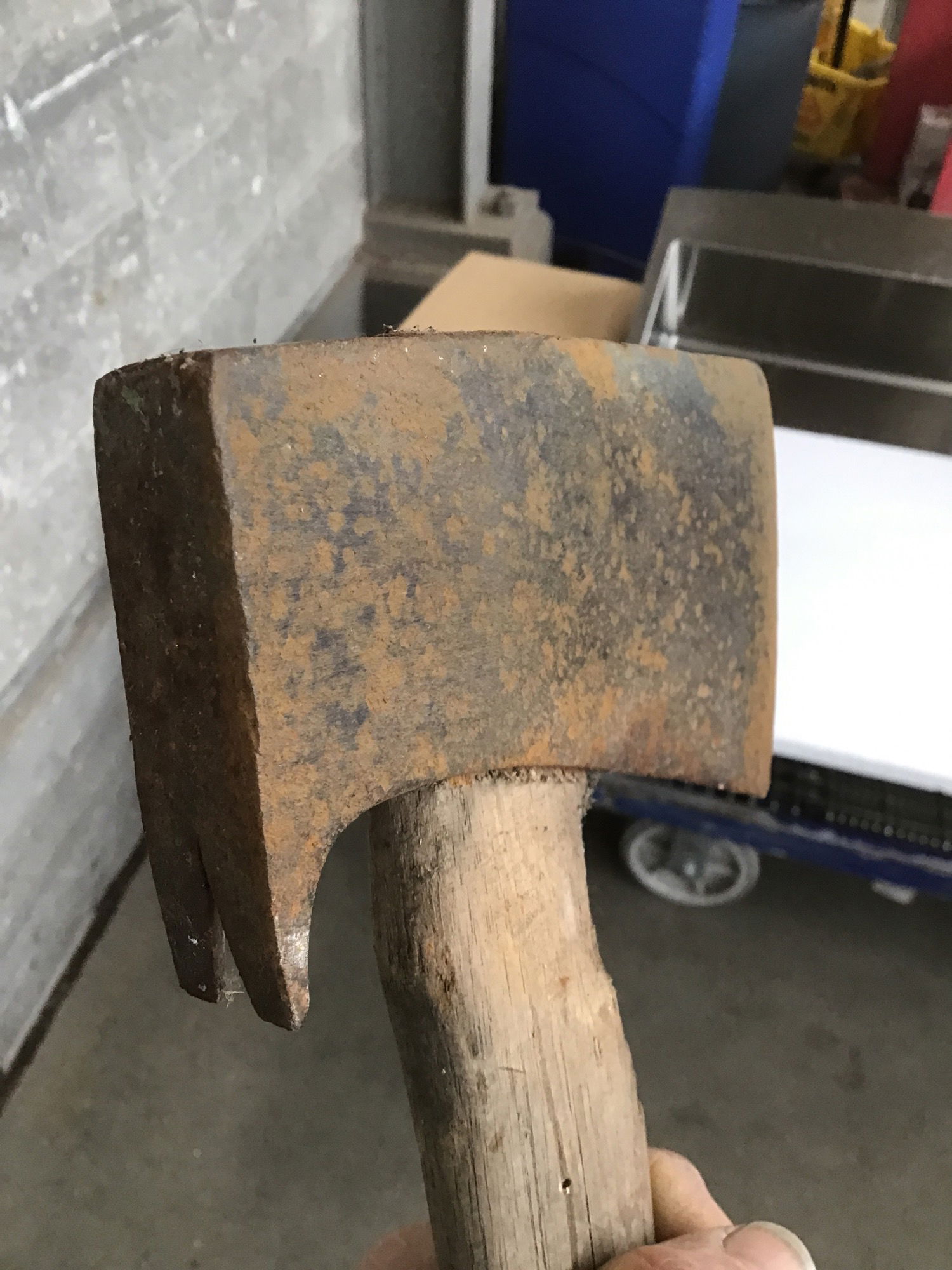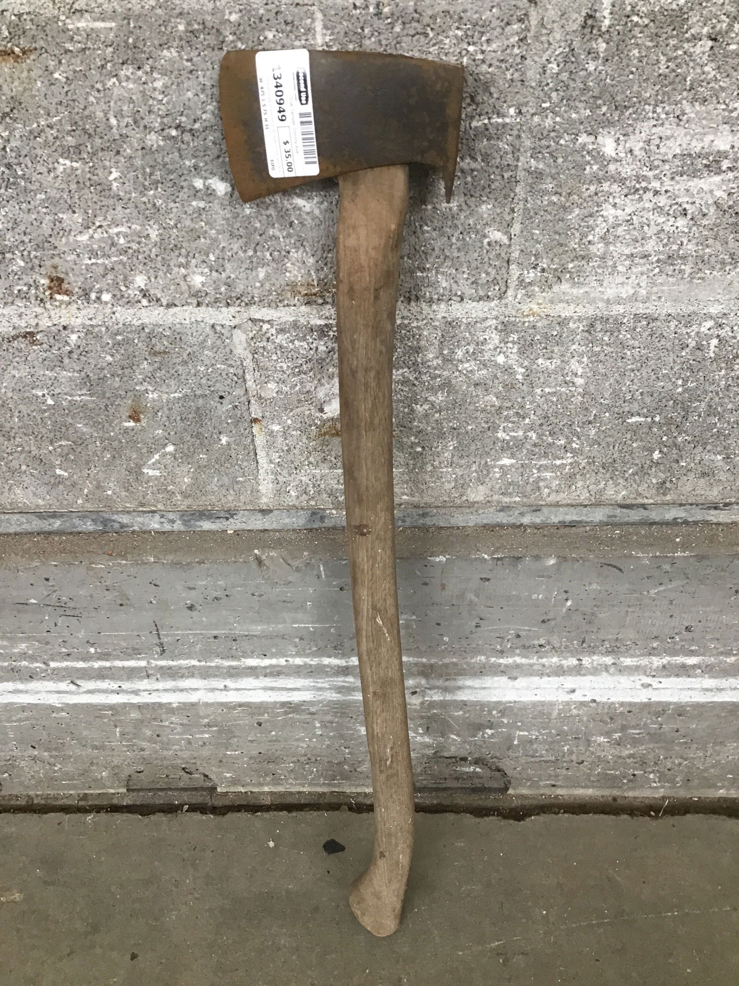 Smallish single bit axe with a nail puller on the back of the head. Marked TrueTemper Tommy Axe. Shows some pitting, but logo is still readable. Handle shows some use, as well.