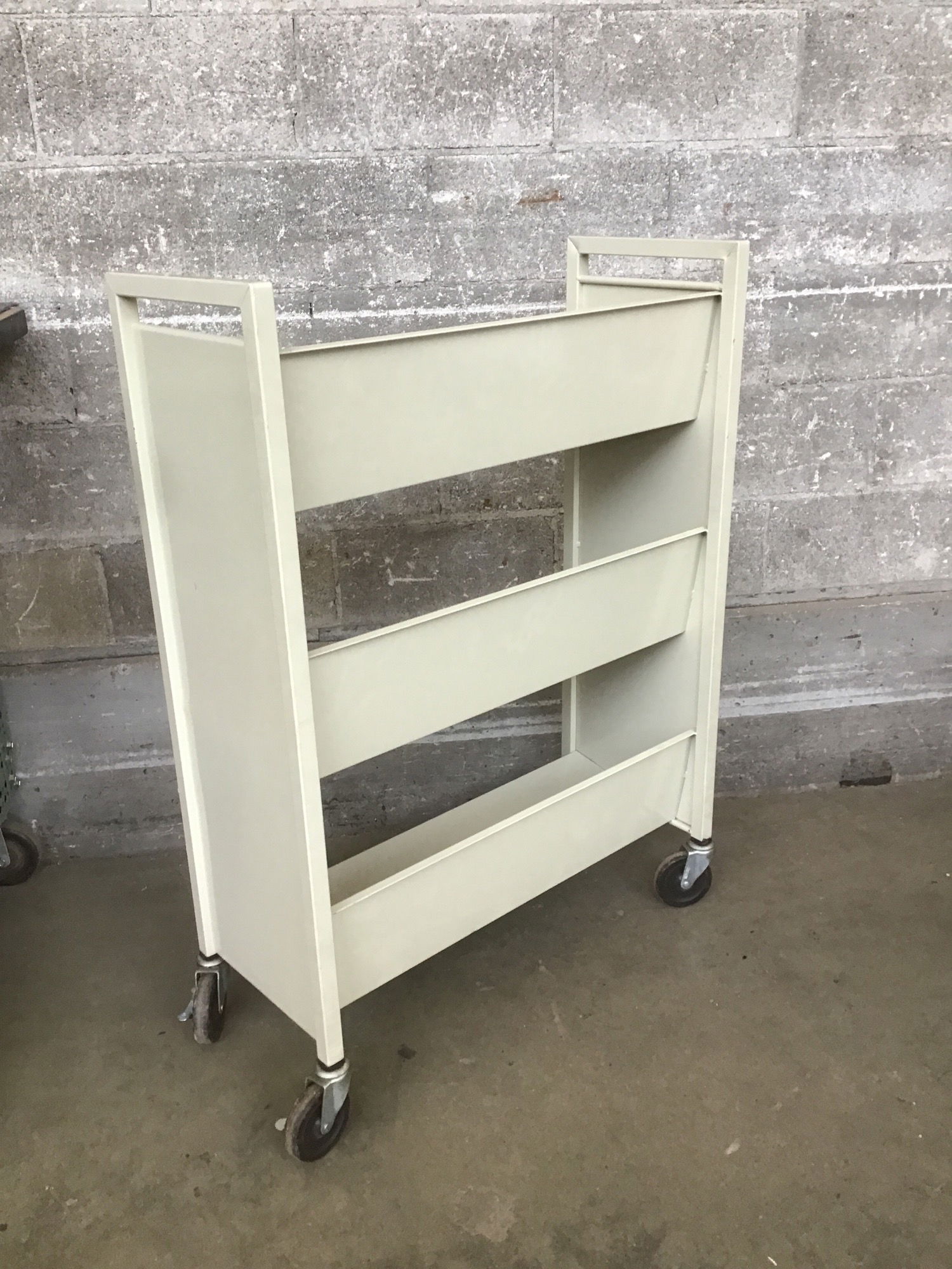Rolling Steel Library Cart with 3 tiers of shelving and rolls on 4 casters, two of which are locking. Painted a light tan color.