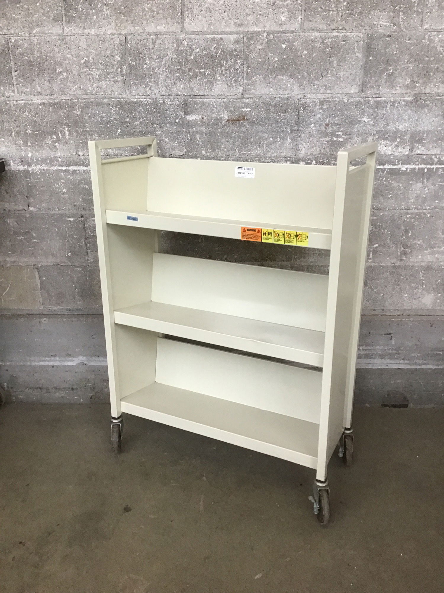 Rolling Steel Library Cart with 3 tiers of shelving and rolls on 4 casters, two of which are locking. Painted a light tan color.