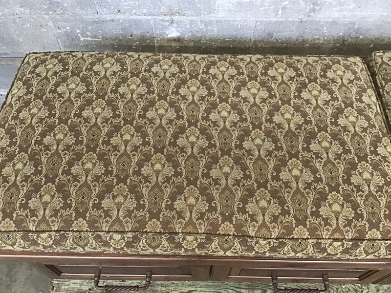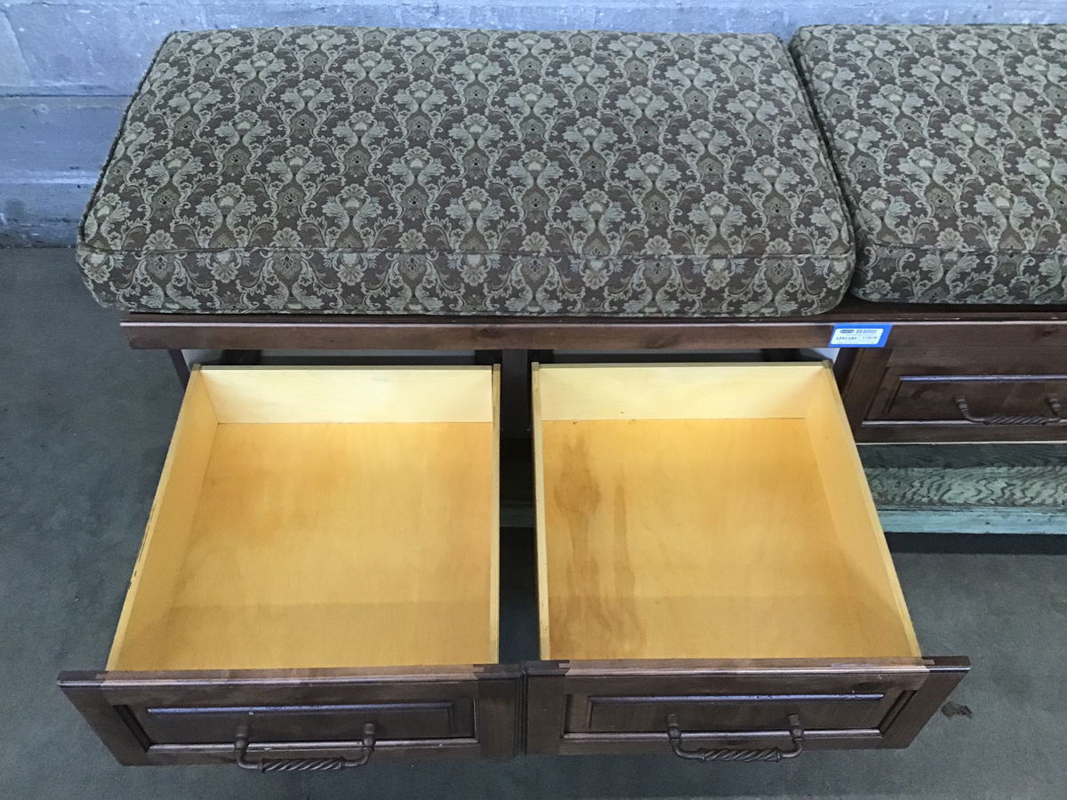 This is a dark stained knotty alder storage bench cabinet that has four drawers that have Tuscan twist pulls. The right side is fully finished and meant to be exposed, the left side is exposed plywood, meant to be butt up against the wall. Comes with two cushions that have a Tuscan pattern as well.