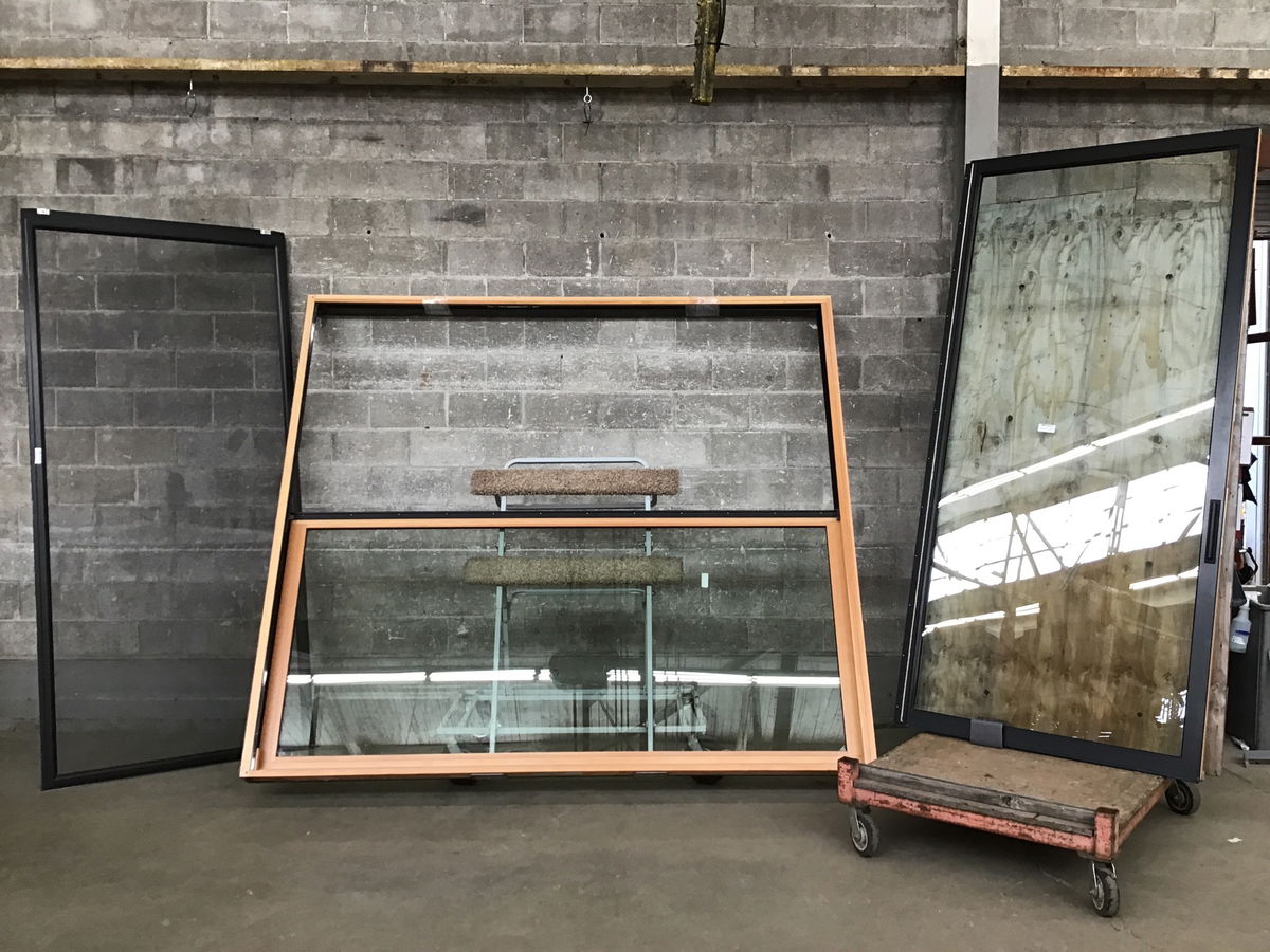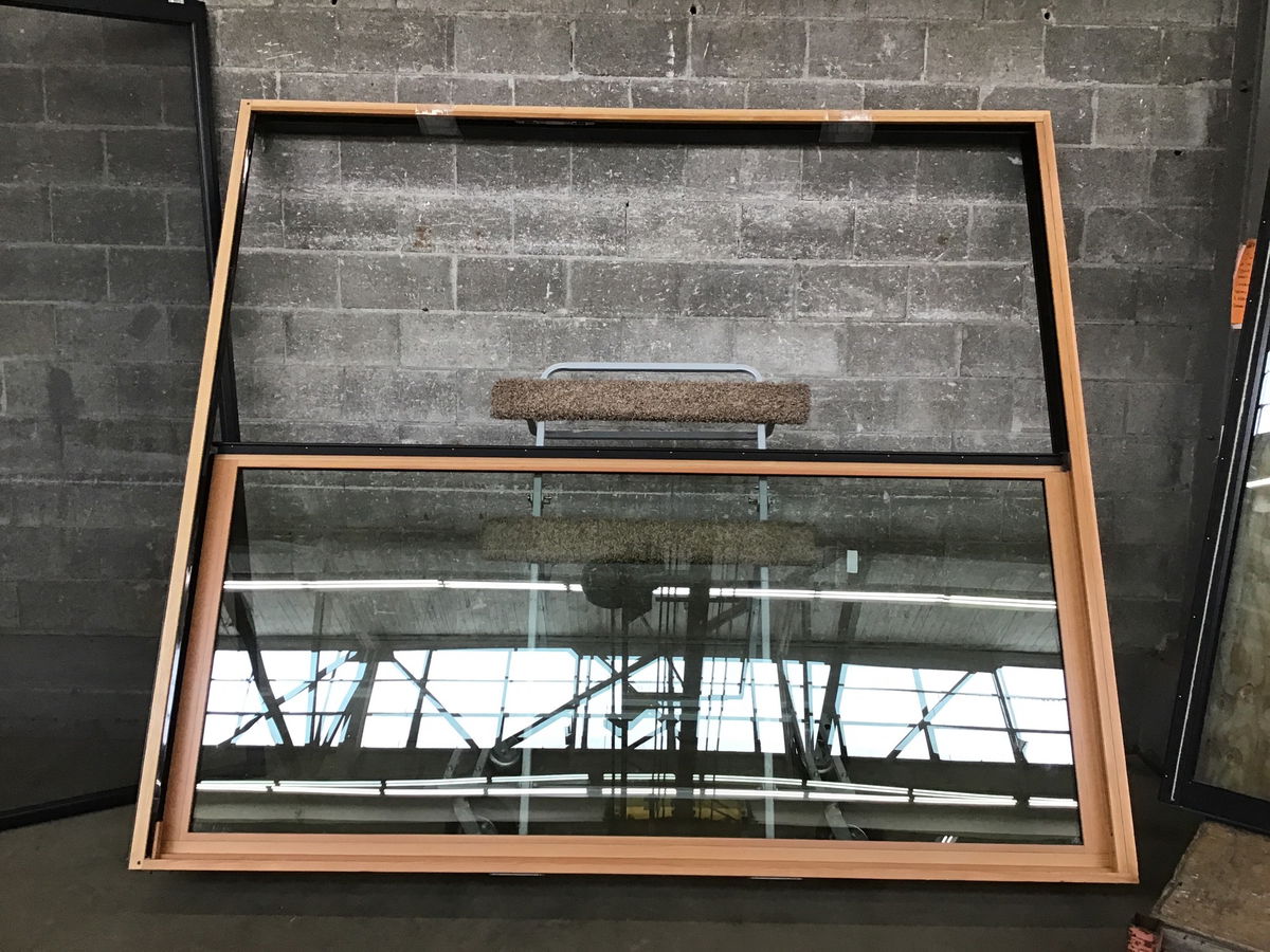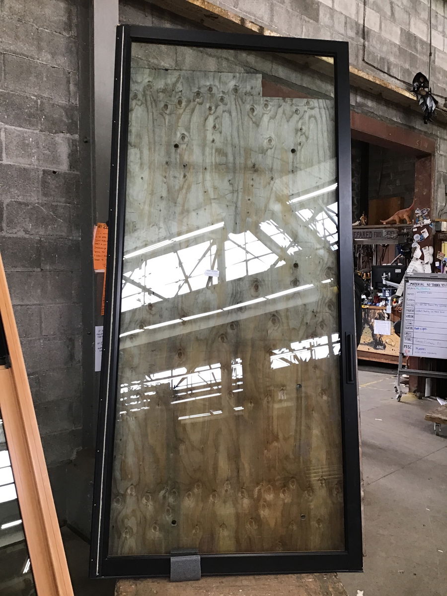 This extremely large black aluminum clad fir slider door with unfinished clear fir interior was a showroom display door. It's never seen weather. Height listed is for the frame. The window that came in with it and is same height (and probably made it same time) is ca. 2019.