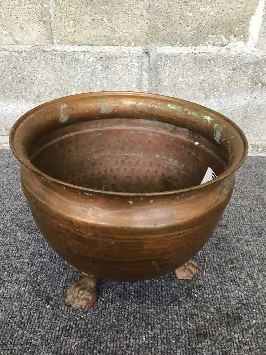 Hammered copper design planter with cast feet.