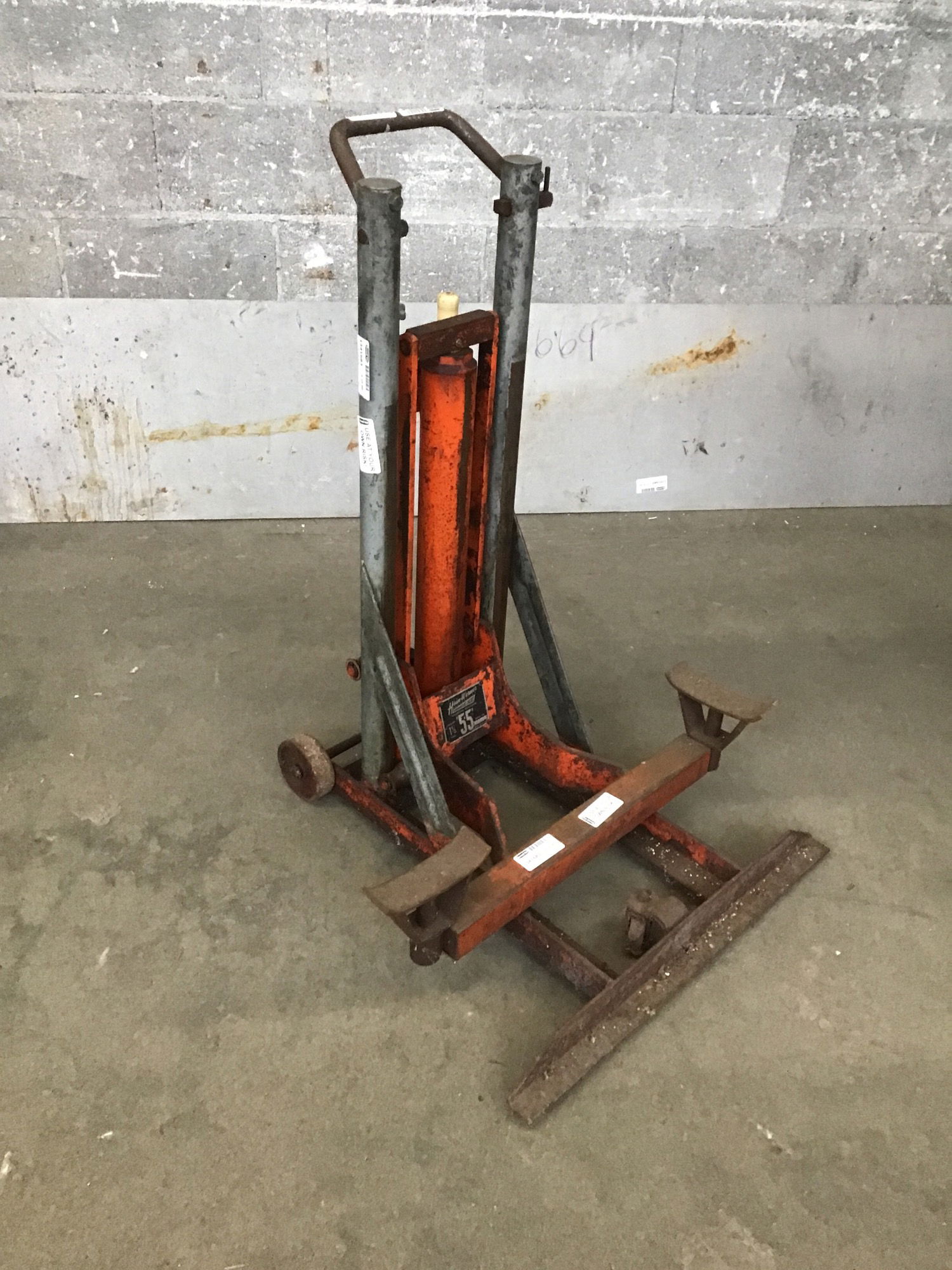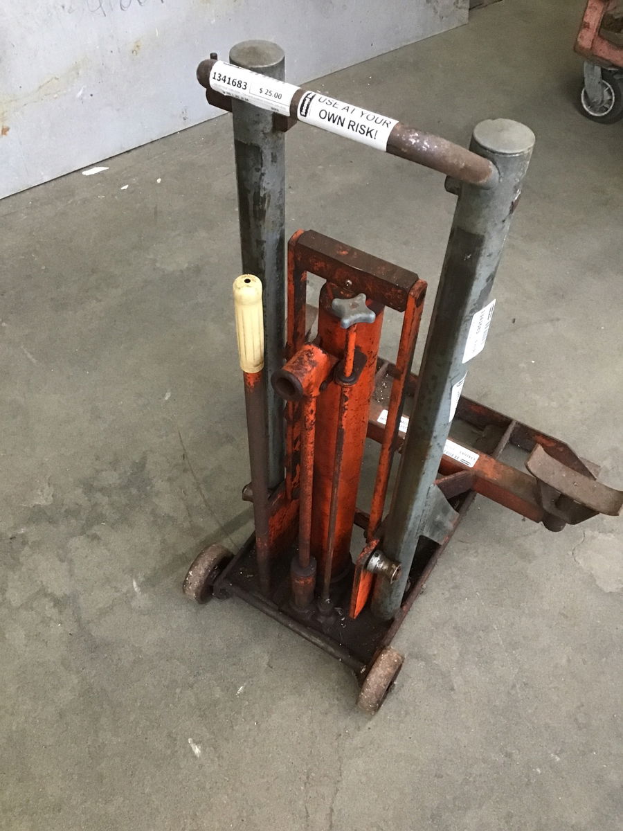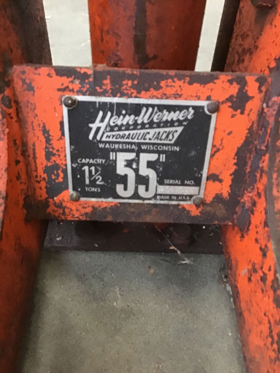 USE AT YOUR OWN RISK! This hand powered Hein-Werner hydraulic auto shop jack would look great in someone's car restoration shop--or it could even hold some flower planters???