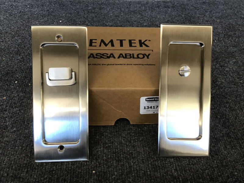 Emtek 2115 pocket door mortise privacy latch, in US15 finish (brushed nickel). Retails for $280+.