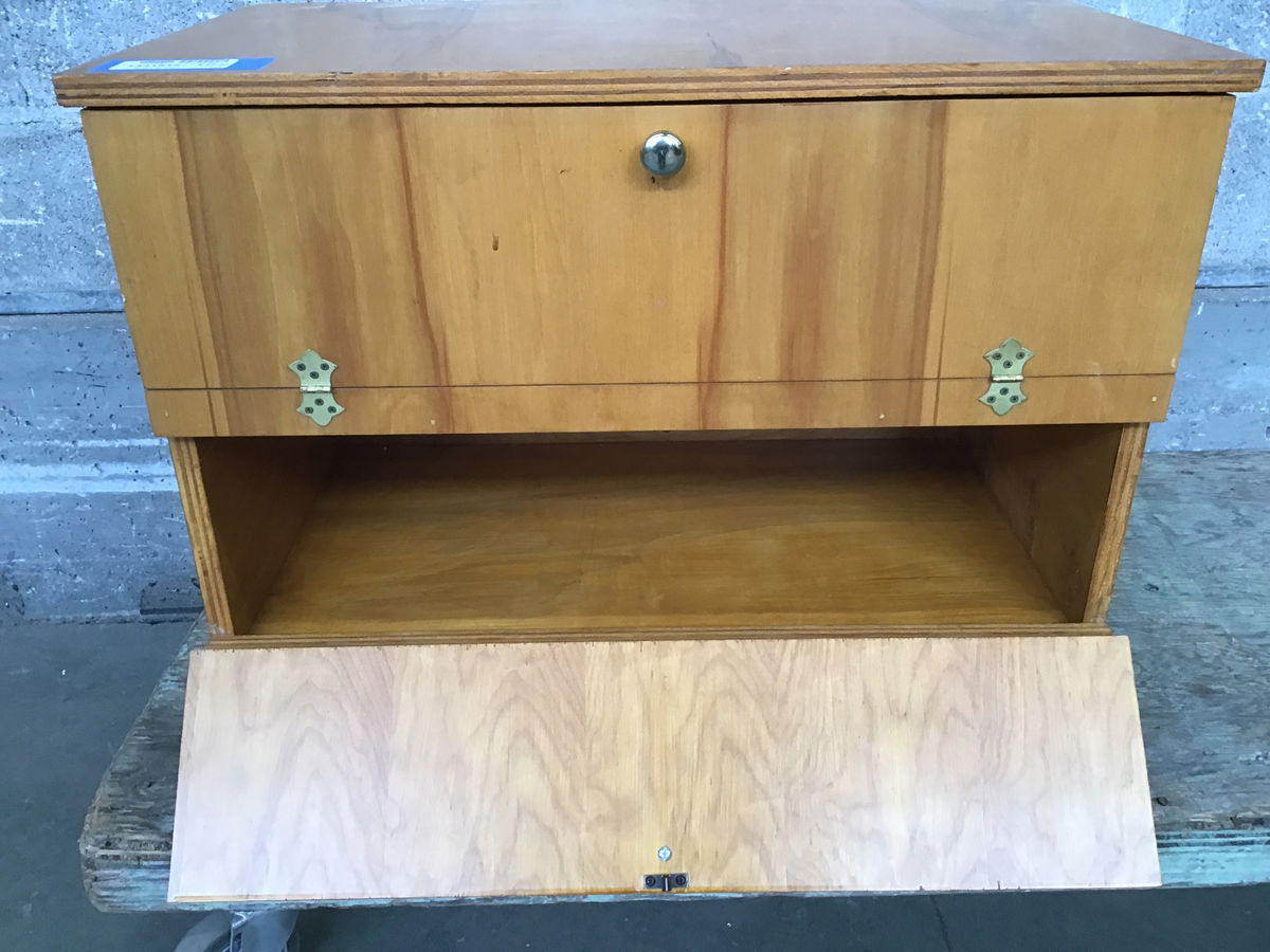 A fun little side table/chest situation with drop-down doors and brass hardware. It's made of nice 3/4in ply, I'm guessing a project from the 60s-80s. Great storage for hobbies and crafts!