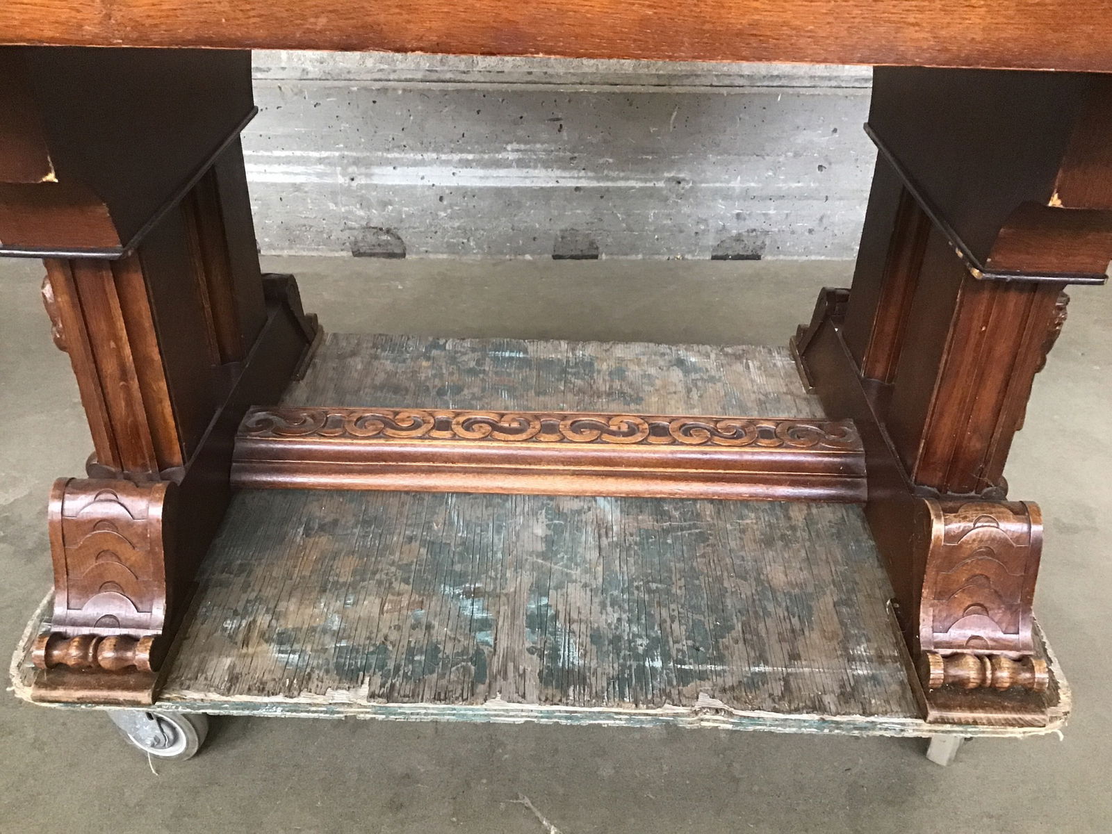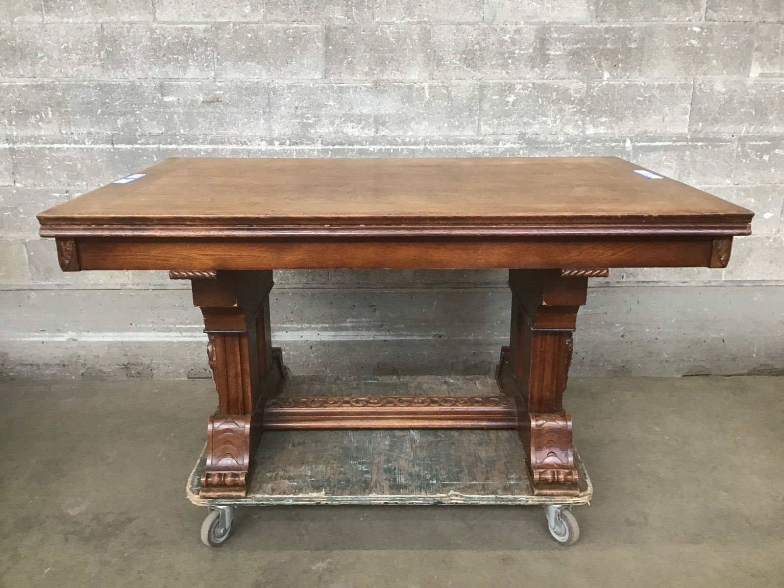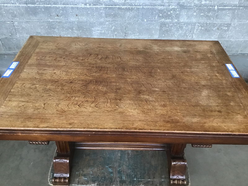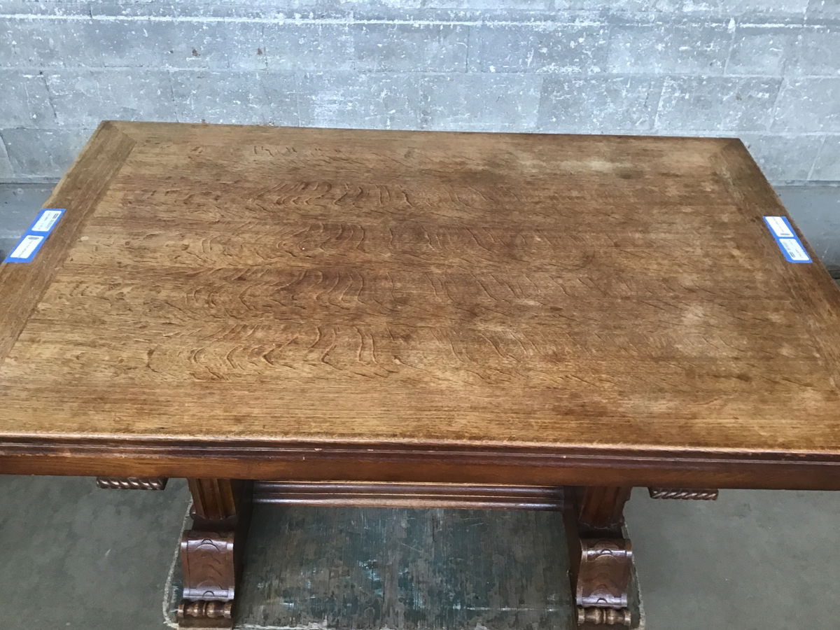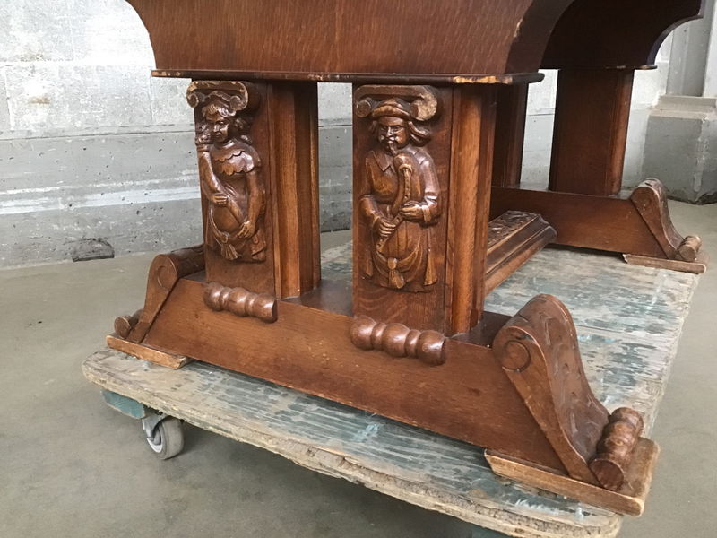 We are just head over heels for this stunning Jacobean/Renaissance revival dining table! Likely circa 1920s or 30s with the most charming bard-esque figures adorning the trestles. Ornate detail abounds in the classical-influenced carved feet, acanthus-ish flourishes, and carved trim everywhere you look! The use of tiger oak adds the final level of character to this beauty, with delicious figuring across the entire table top. There are two concealed leaves that slide out from either end for an additional ~40in or so - enough space to hold a proper banquet!