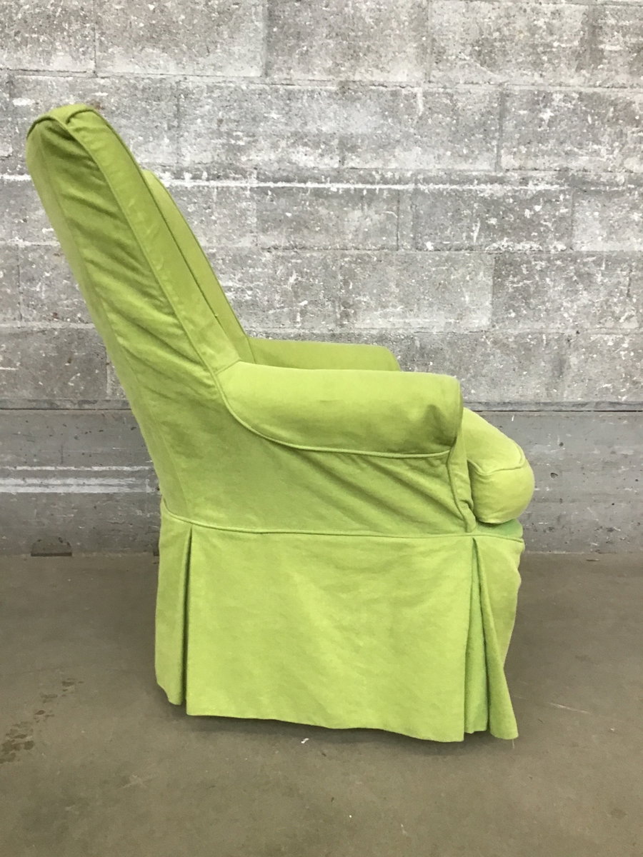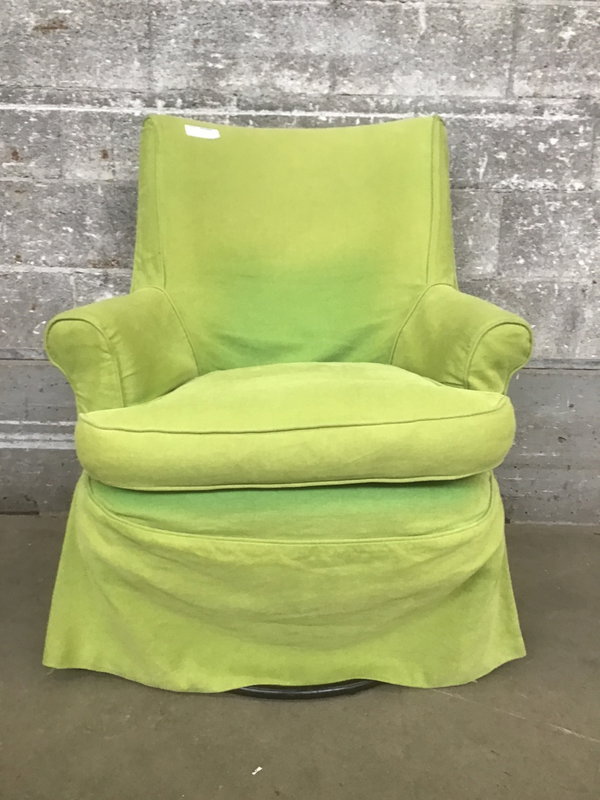 Handcrafted by the folks at Lee Industries (it even has a tag under the slipcover with the signatures of its builders), this is a kinda groovy, kinda swanky swivel chair for your living room. It's currently sporting a lime green slipcover that's had its tone lightened a bit by sun and time. While I wasn't able to find this exact chair online (I believe that Lee must have retired the style), other Lee swiveling armchairs typically seem to range in price from around $2,000 to over $3,500.