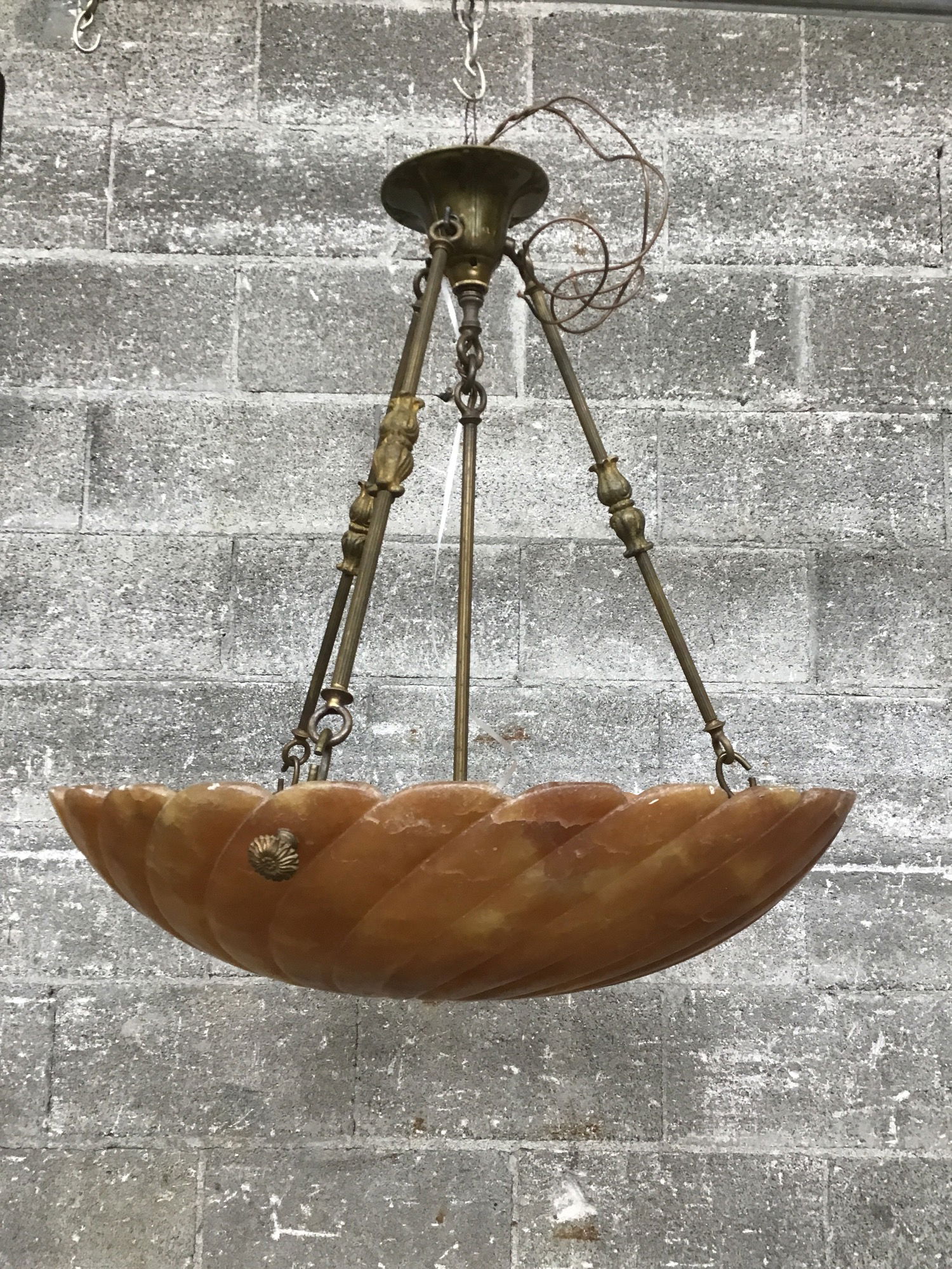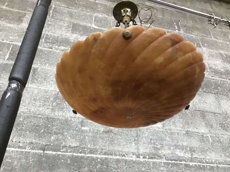 This grand alabaster (is it still alabaster if it's golden brown?) bowl chandelier was purportedly originally purchased in Italy and later imported, then converted to American electric standards. It definitely has been rewired recently, and is in pretty stellar condition overall! If I had to guess, I'd date it to somewhere in the 1910s-30s. this beauty is sure to set your space aglow!