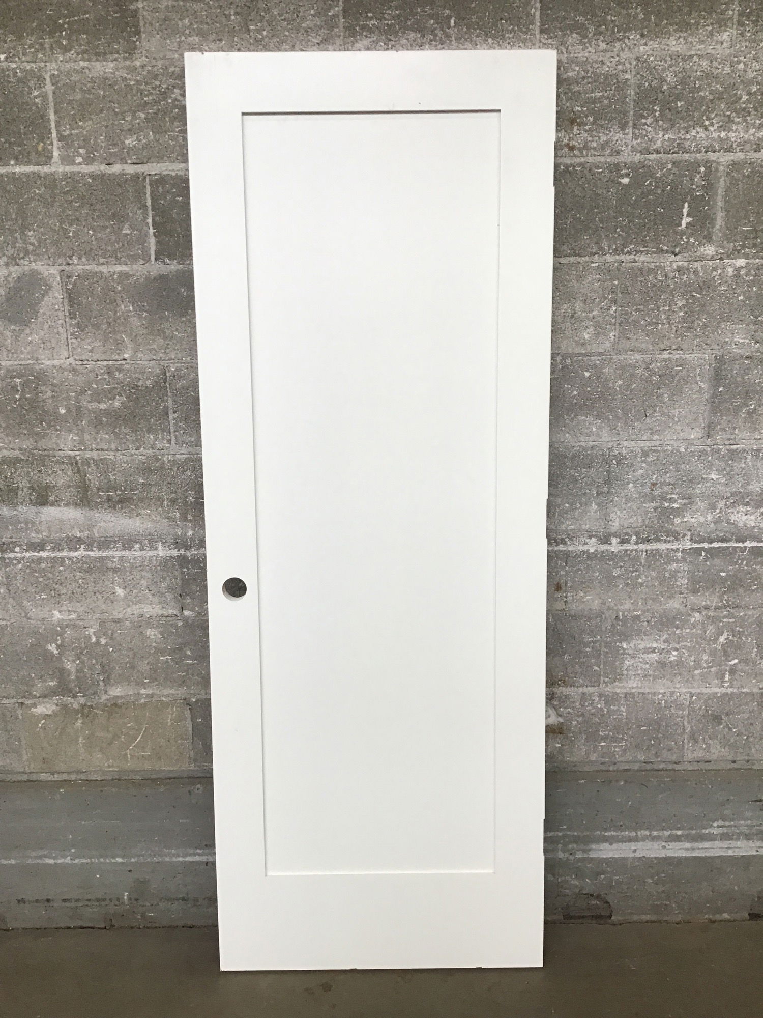 Shaker style primed masonite single panel interior door in good condition.