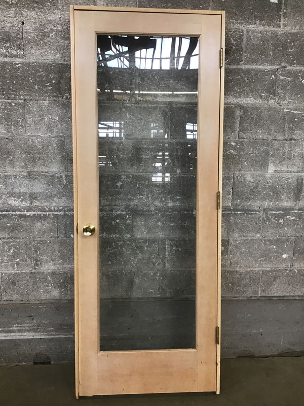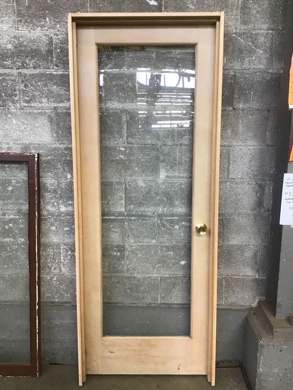 A pre-hung door with a single pane of glass and rich fir construction that shows off the wood's beautiful clear vertical grain.