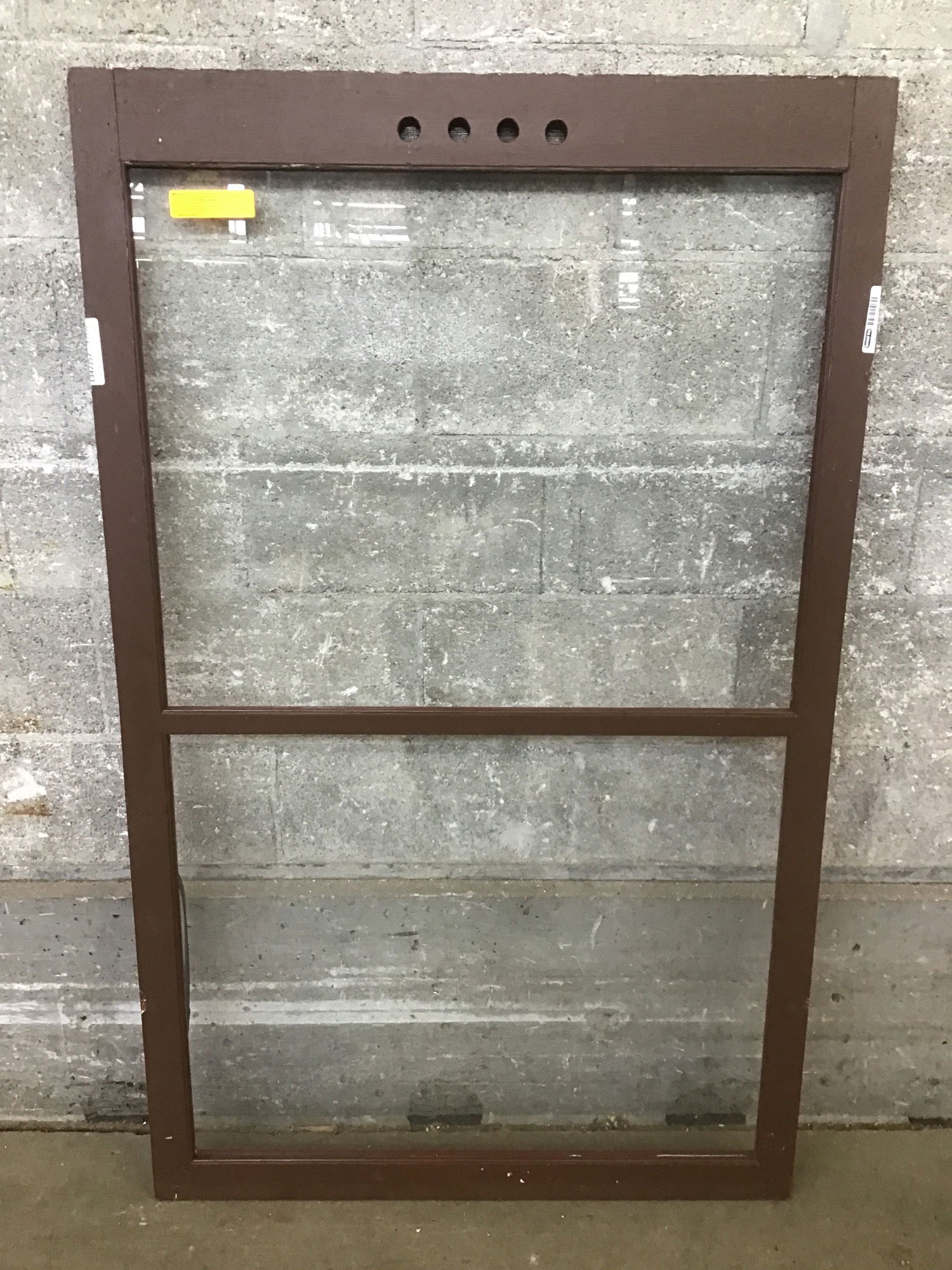 A vintage wood window with two divided panes of old-style wavy glass, with one side painted red and the other side brown. It looks like somebody drilled some little holes and built a cute little vent with some chicken wire and a slide to close it and keep the rats and vermin out- a fixed window with a bit of ventilation!