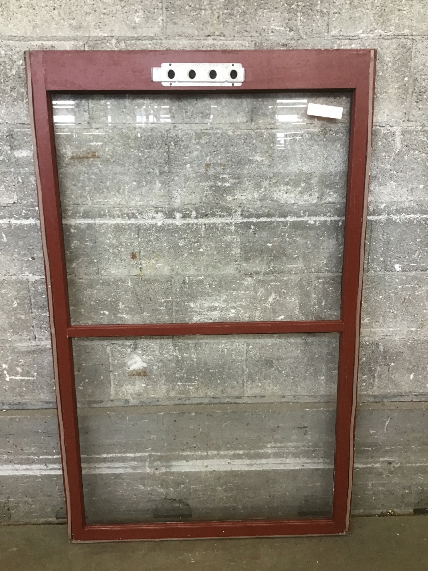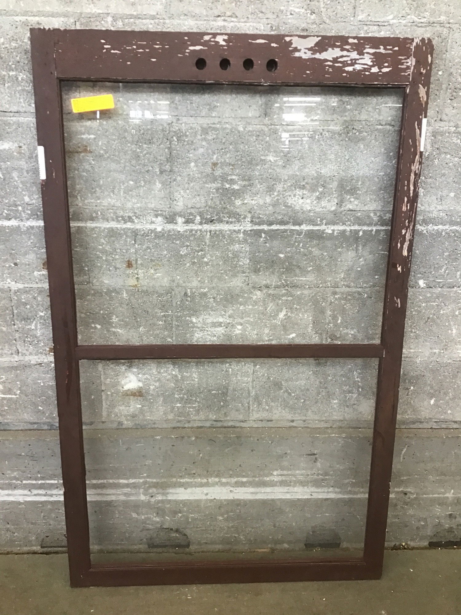 A vintage wood window with two divided panes of old-style wavy glass, with one side painted red and the other side brown. It looks like somebody drilled some little holes and built a cute little vent with some chicken wire and a slide to close it and keep the rats and vermin out- a fixed window with a bit of ventilation!