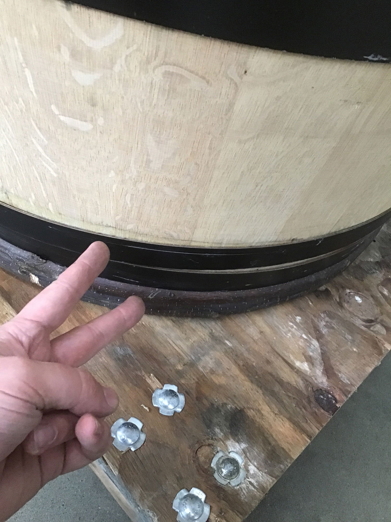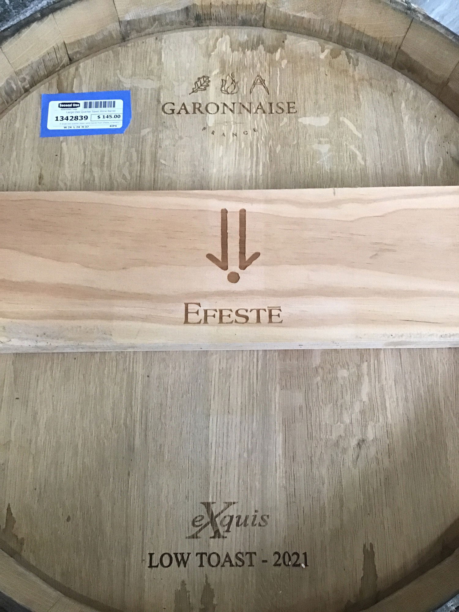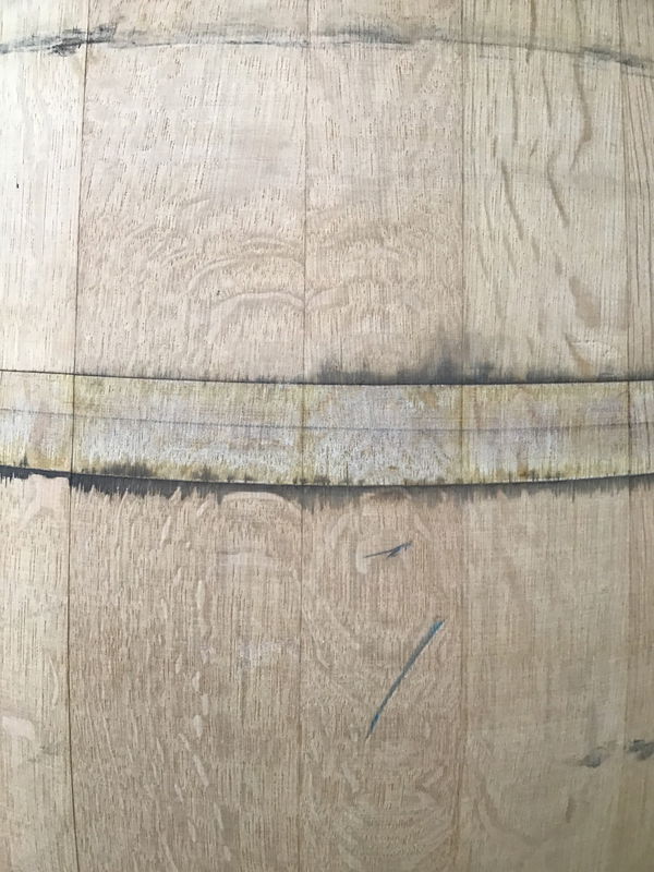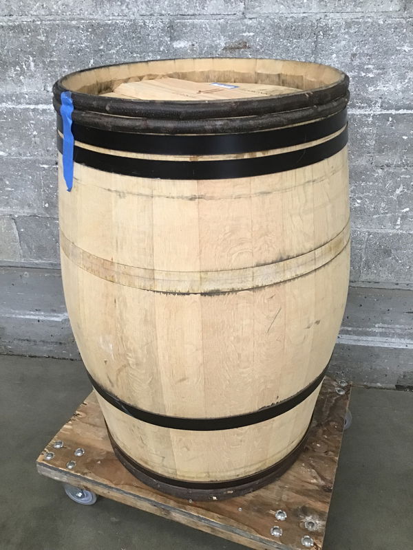 A large oak quarter sawn wind barrel from Efeste, a winery located near Woodinville WA. One of the rings has slipped down, but it could be pushed up with enough elbow grease perhaps?