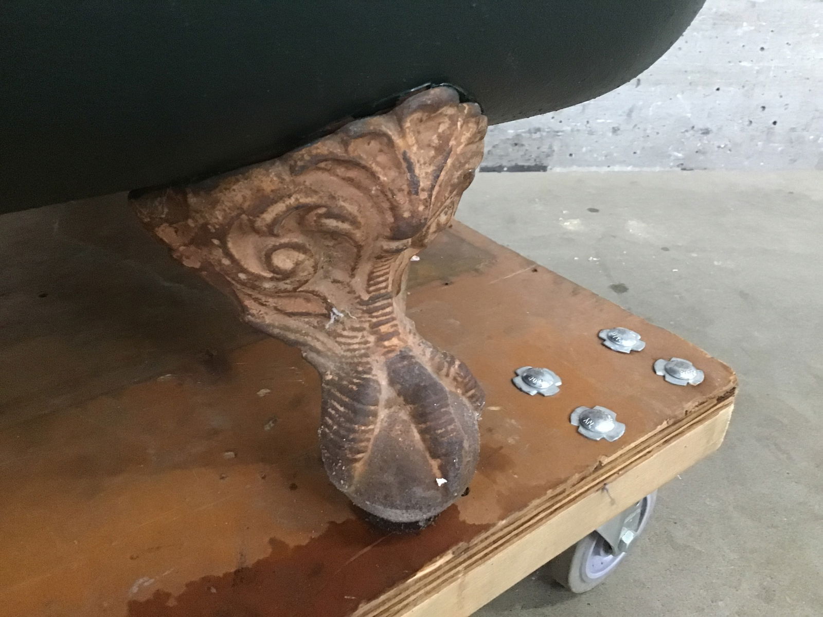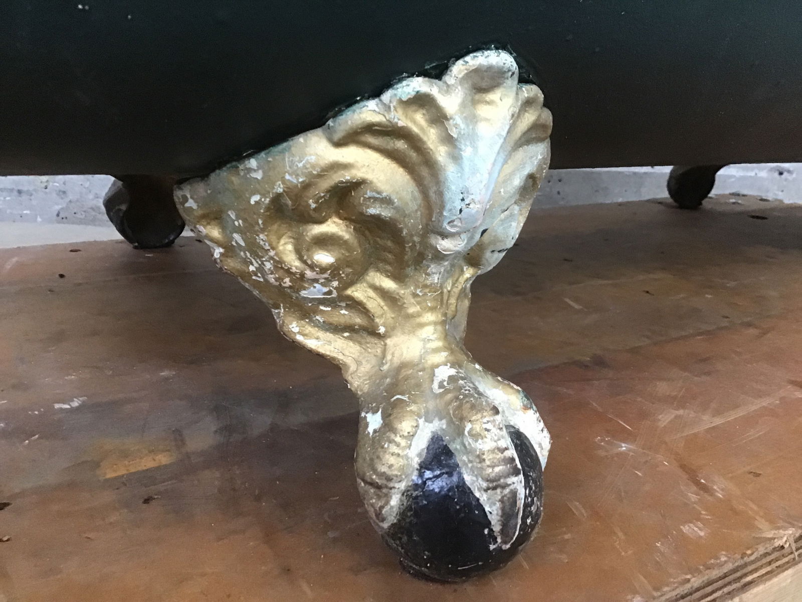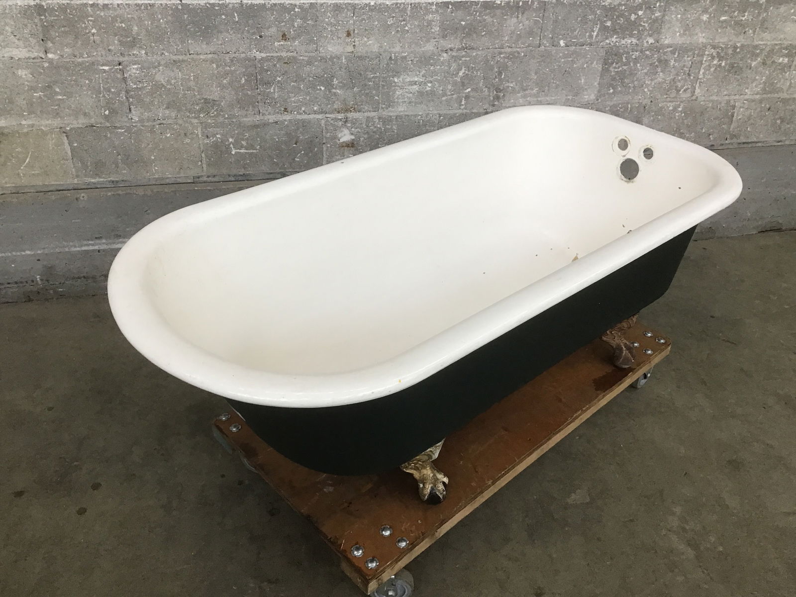 This is a 5' clawfoot tub that is painted forest green on the exterior and is white on the interior. has 4 awesome clawfeet that are fashioned like actual fowl feet clutching black orbs. There are some small chips here and there around the rim but nothing major. There is some wear at the drain as well.