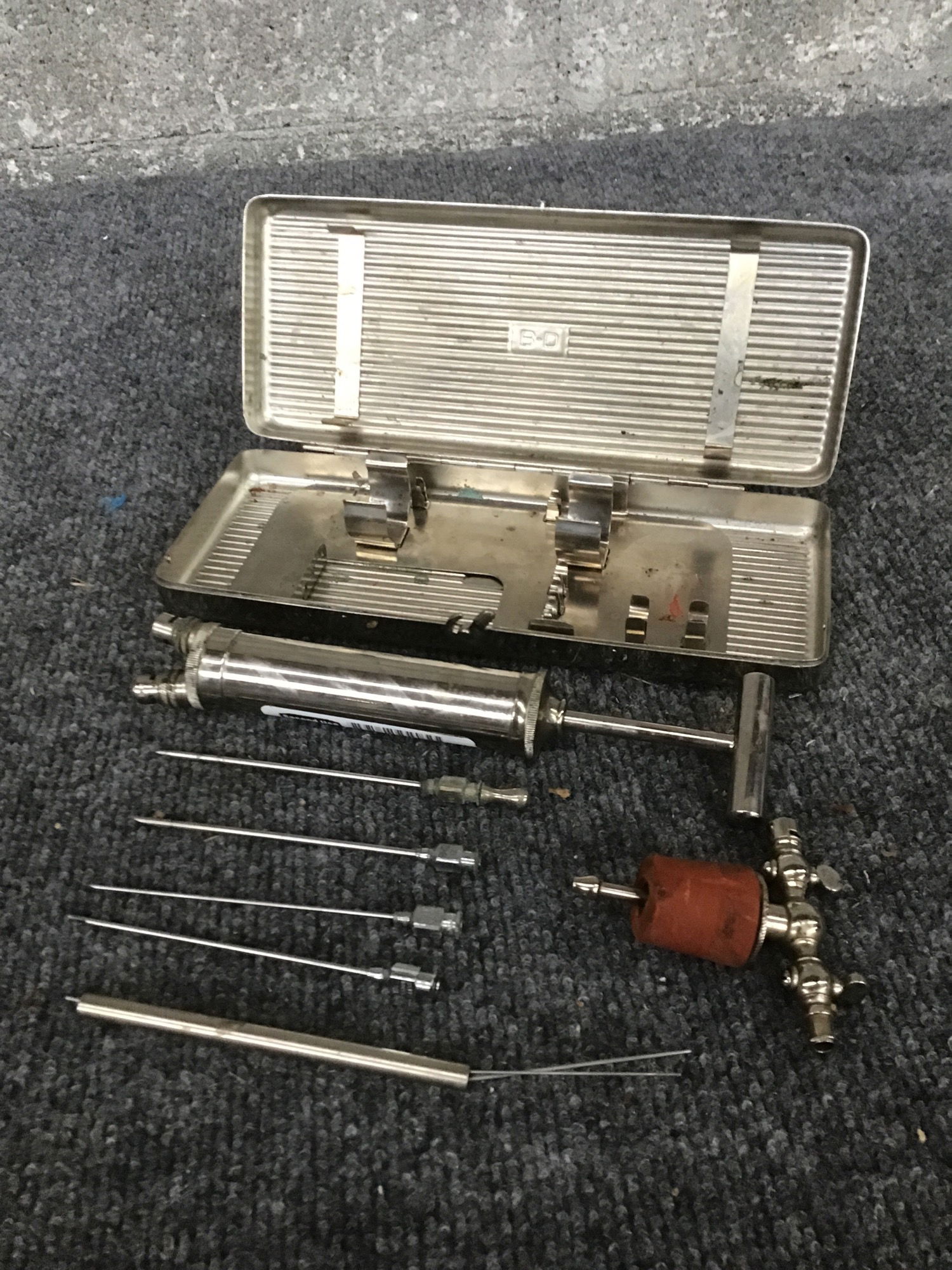 Consists of a syringe with two outlets, a t-splitter valve assembly, and a handful of needles. Not sure of the device's name or purpose, but maybe that's a mystery you can solve.
