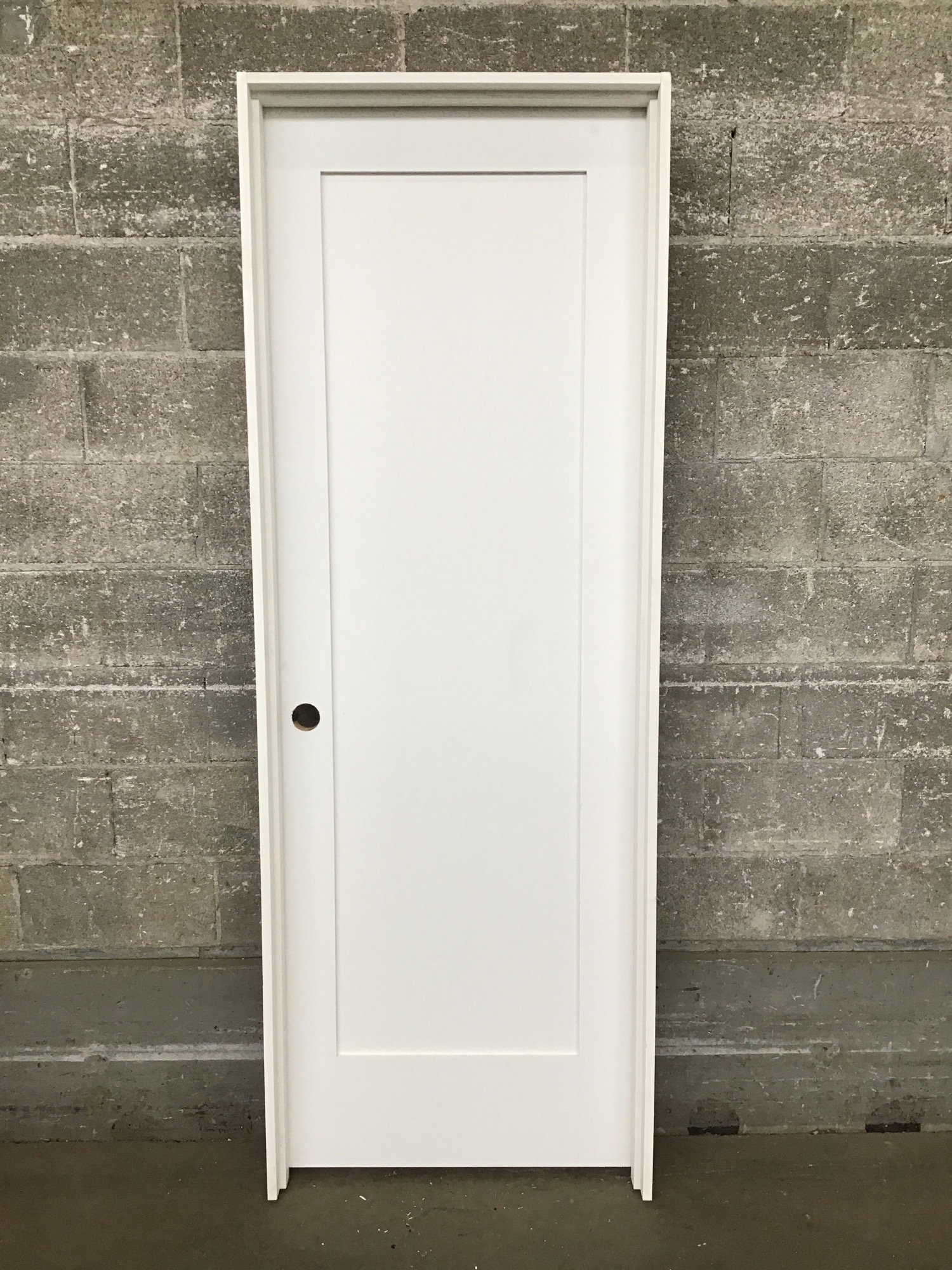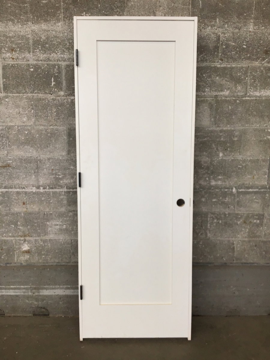 Fresh, crisp, brand new shaker style single panel door with matte black hardware and solid wood jamb, ready to be hung!
