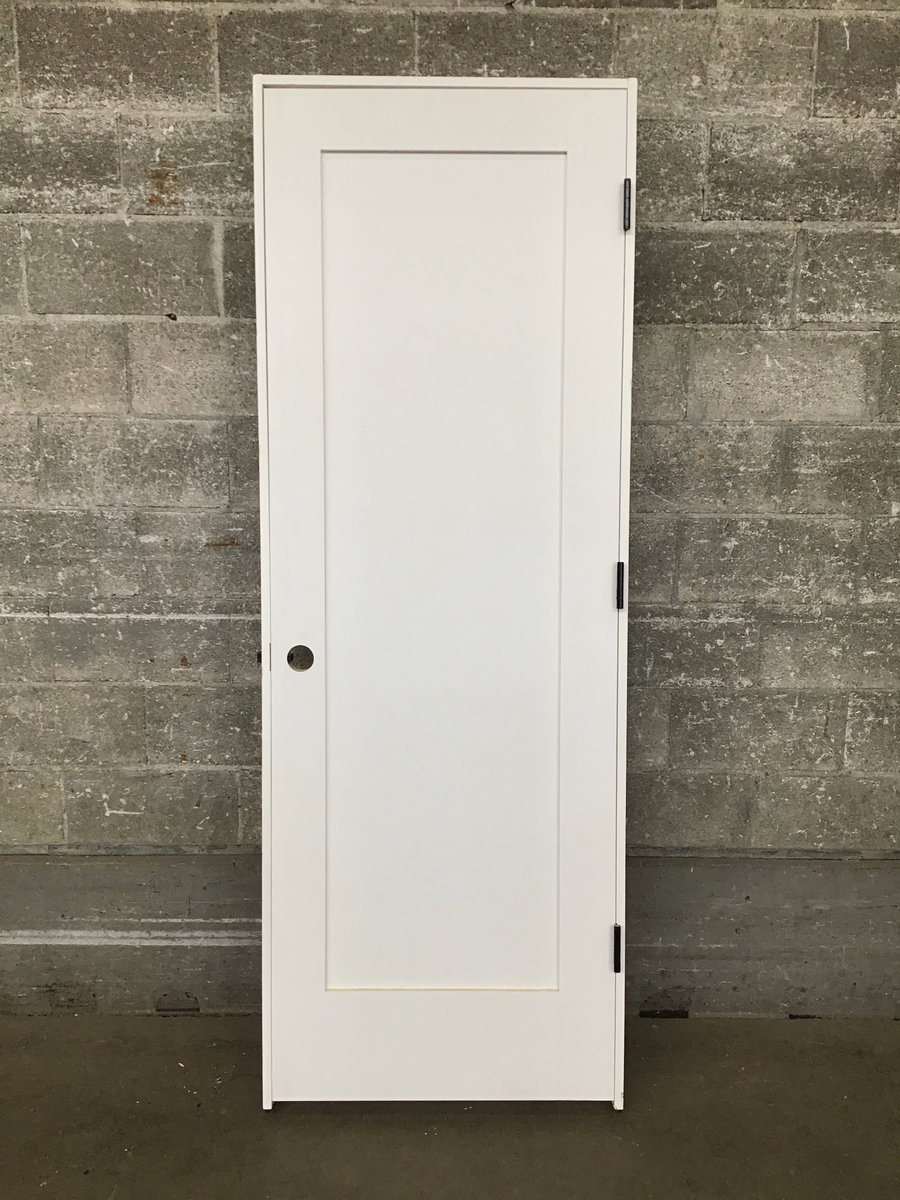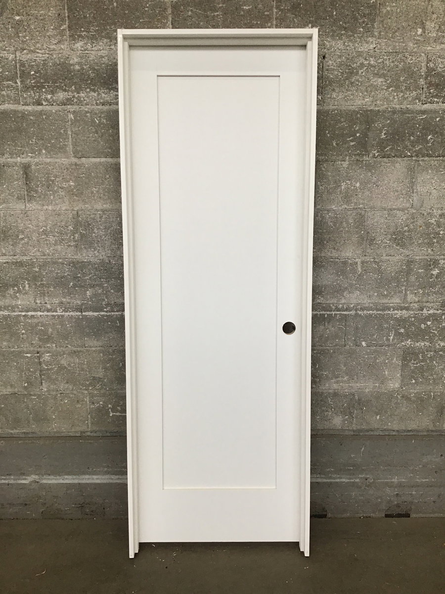 Fresh, crisp, brand new shaker style single panel door with matte black hardware and solid wood jamb, ready to be hung!