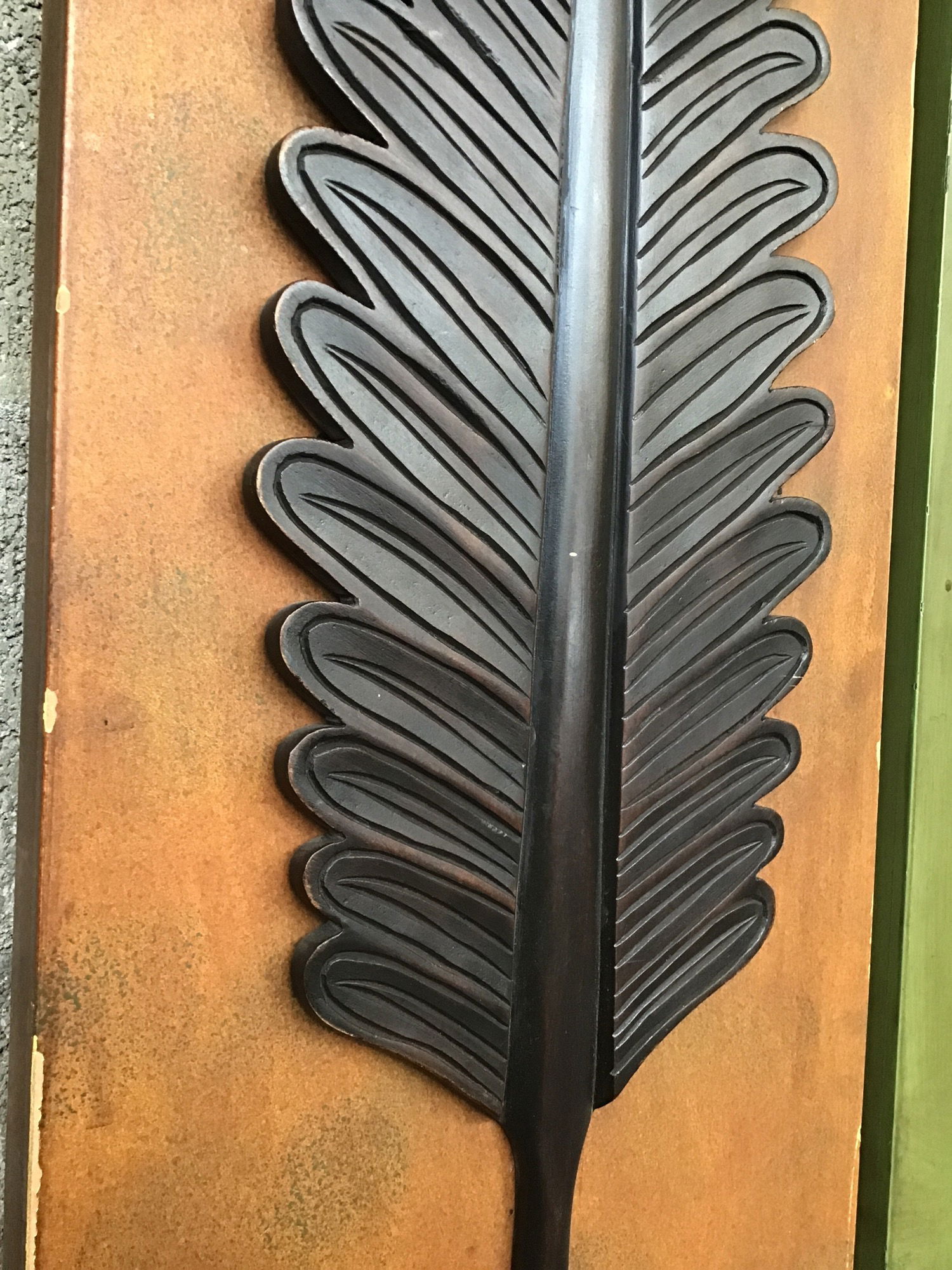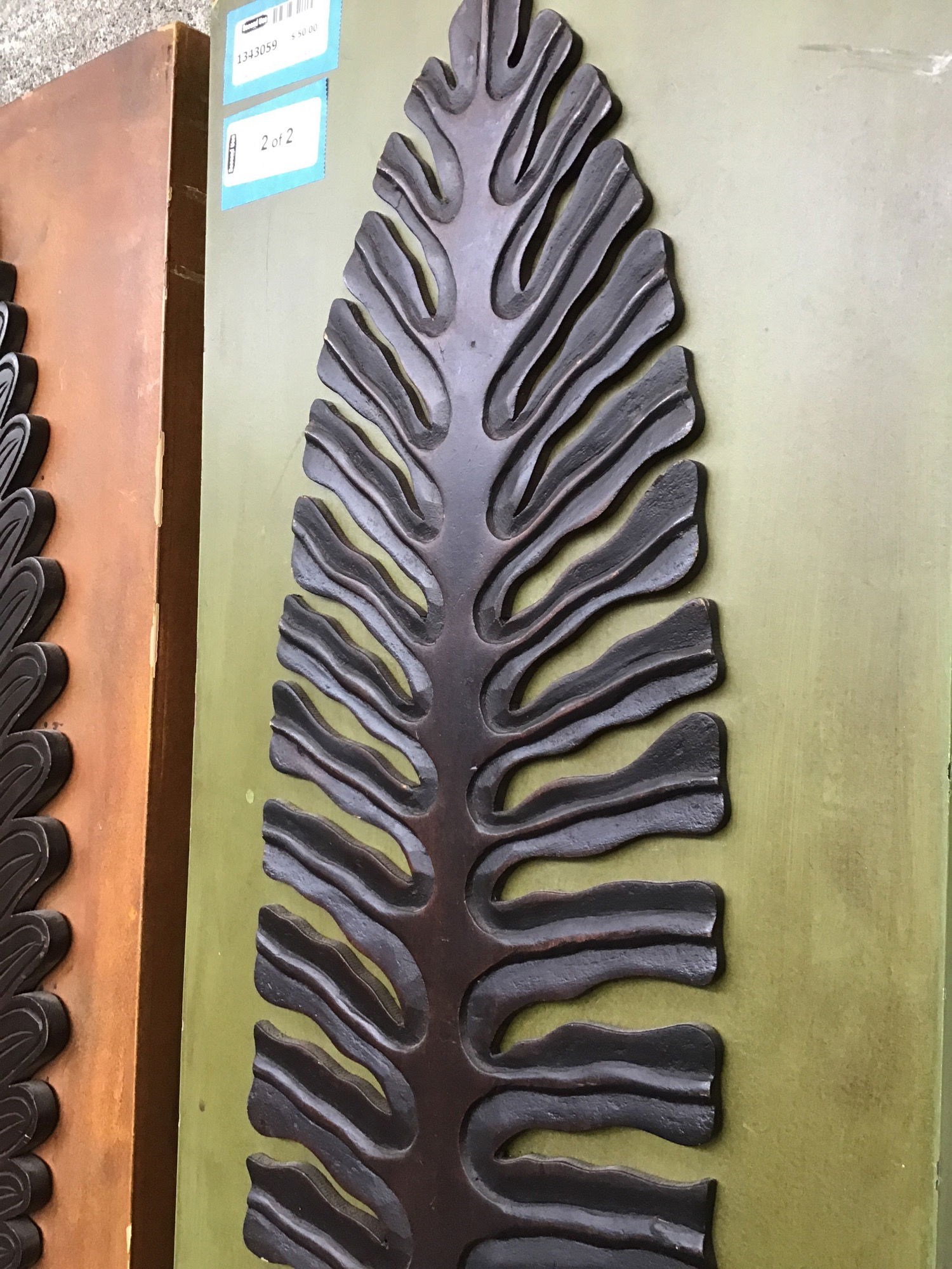 Pair of wall hangings with large carved wooden leaves on their fronts. The leaves are well-made and the background colors are soothing and complementary brown and green.