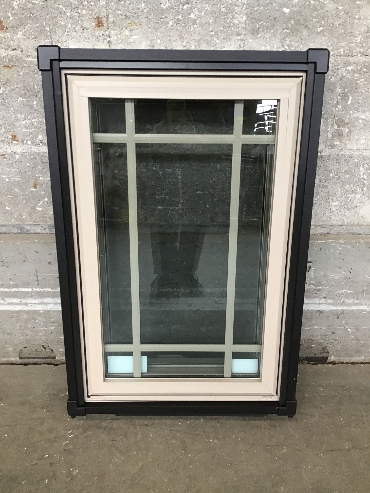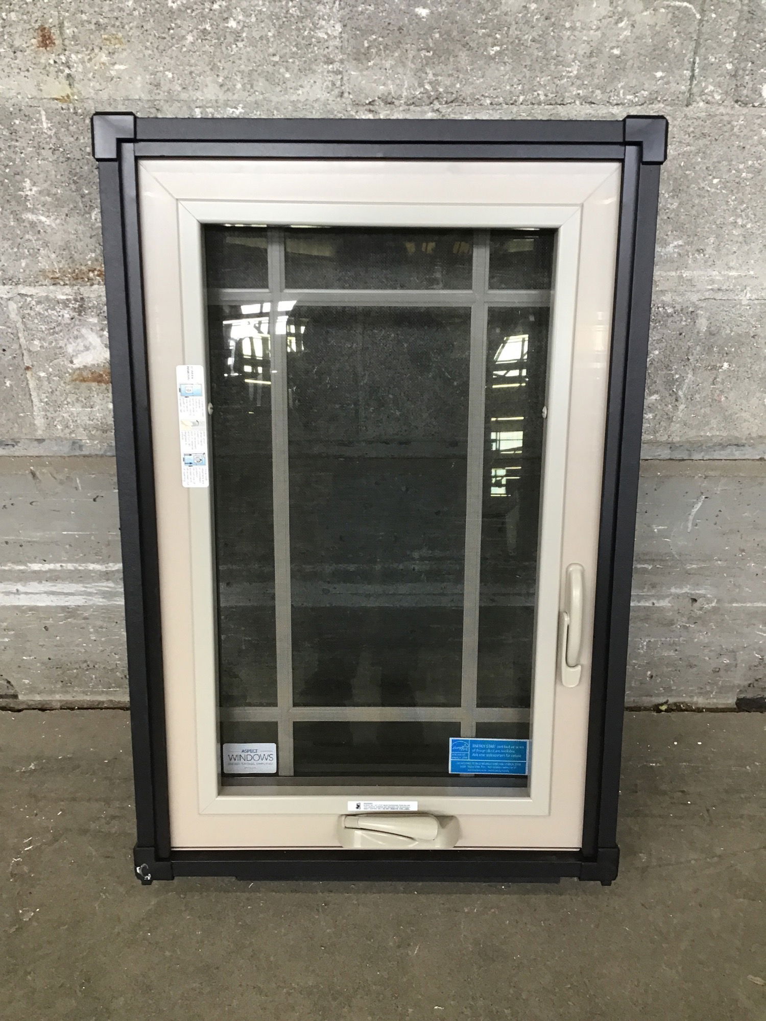 New sample casement window currently encased in a frame with a handle making it easy to move, the window itself is smaller than the case/dimensions listed. It appears the case can be removed.