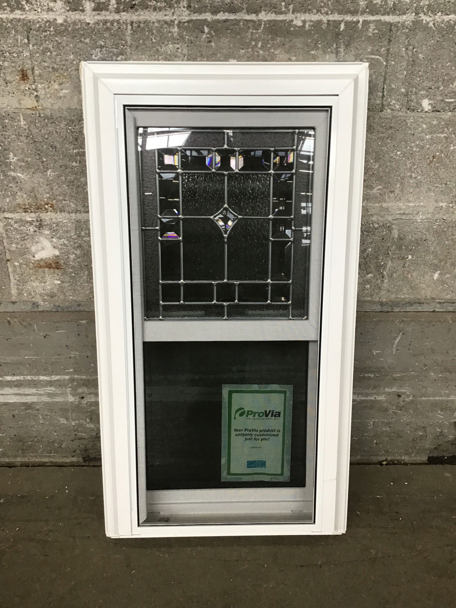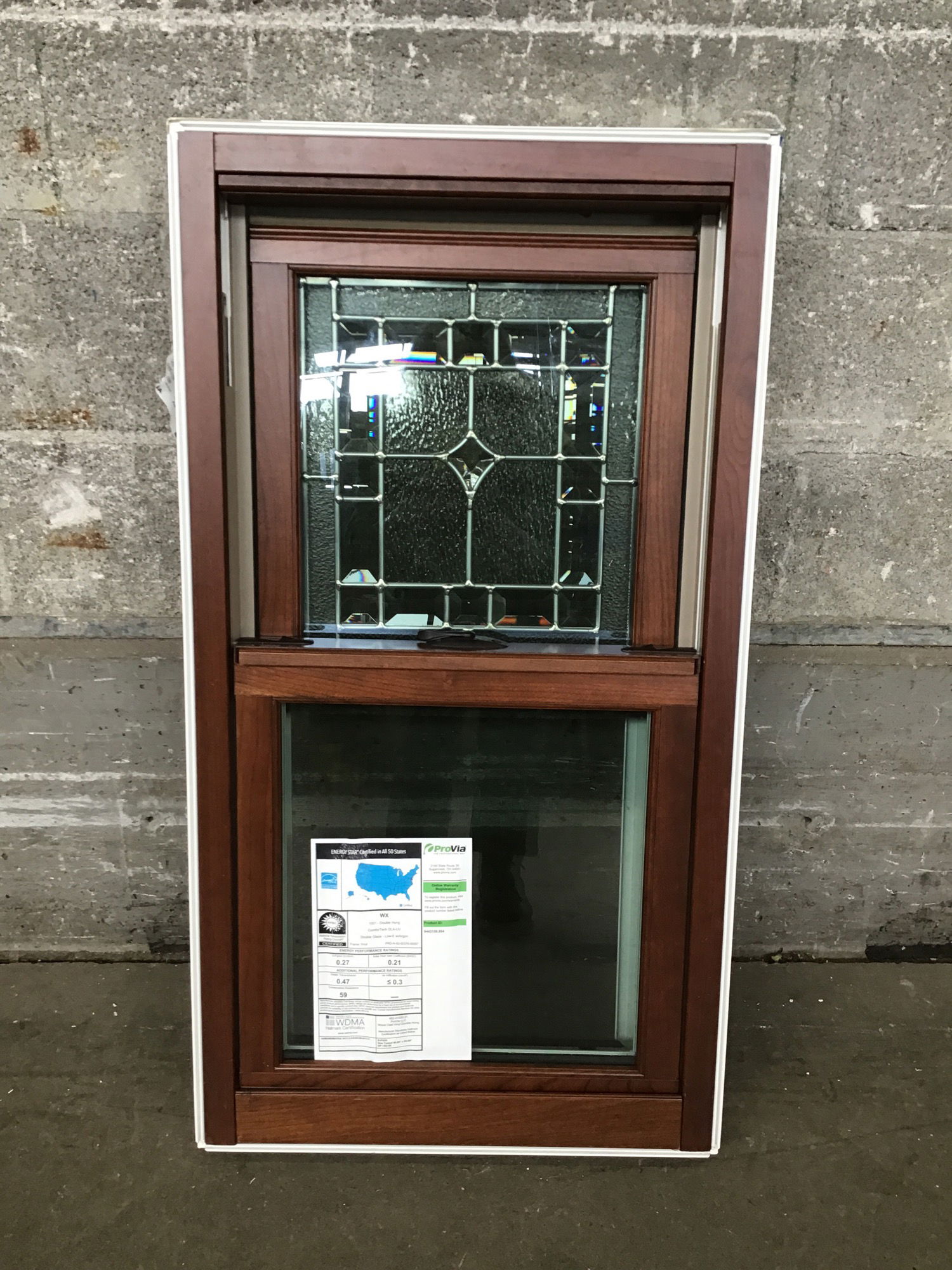 New compact double hung vinyl window with faux wood finish on the inside and zinc divided glass design on the top pane.