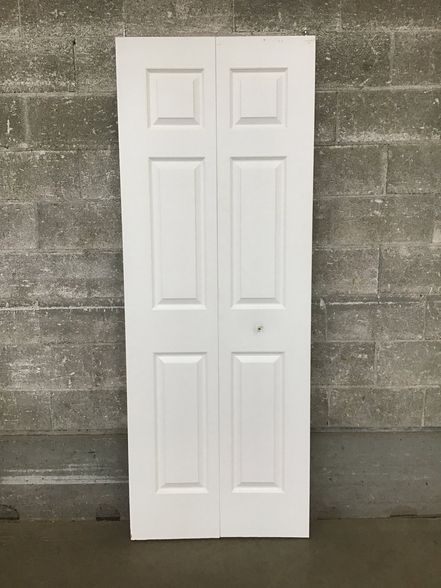Faux wood grain, faux six panel hollow core bifold door.