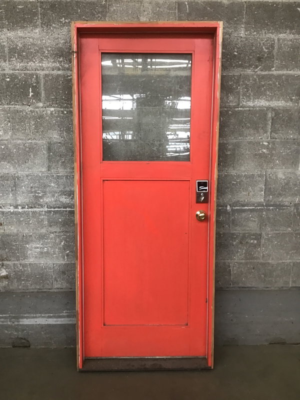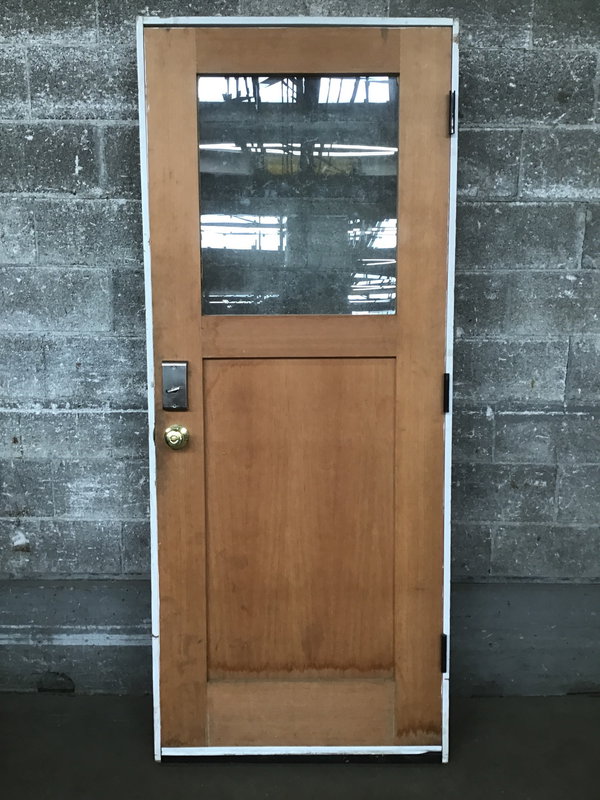 Exterior half lite door in jamb with insulated glass above a Shaker style panel. Outside is painted. Interior was never finished and has a little condensation staining. Still a nice looking door.