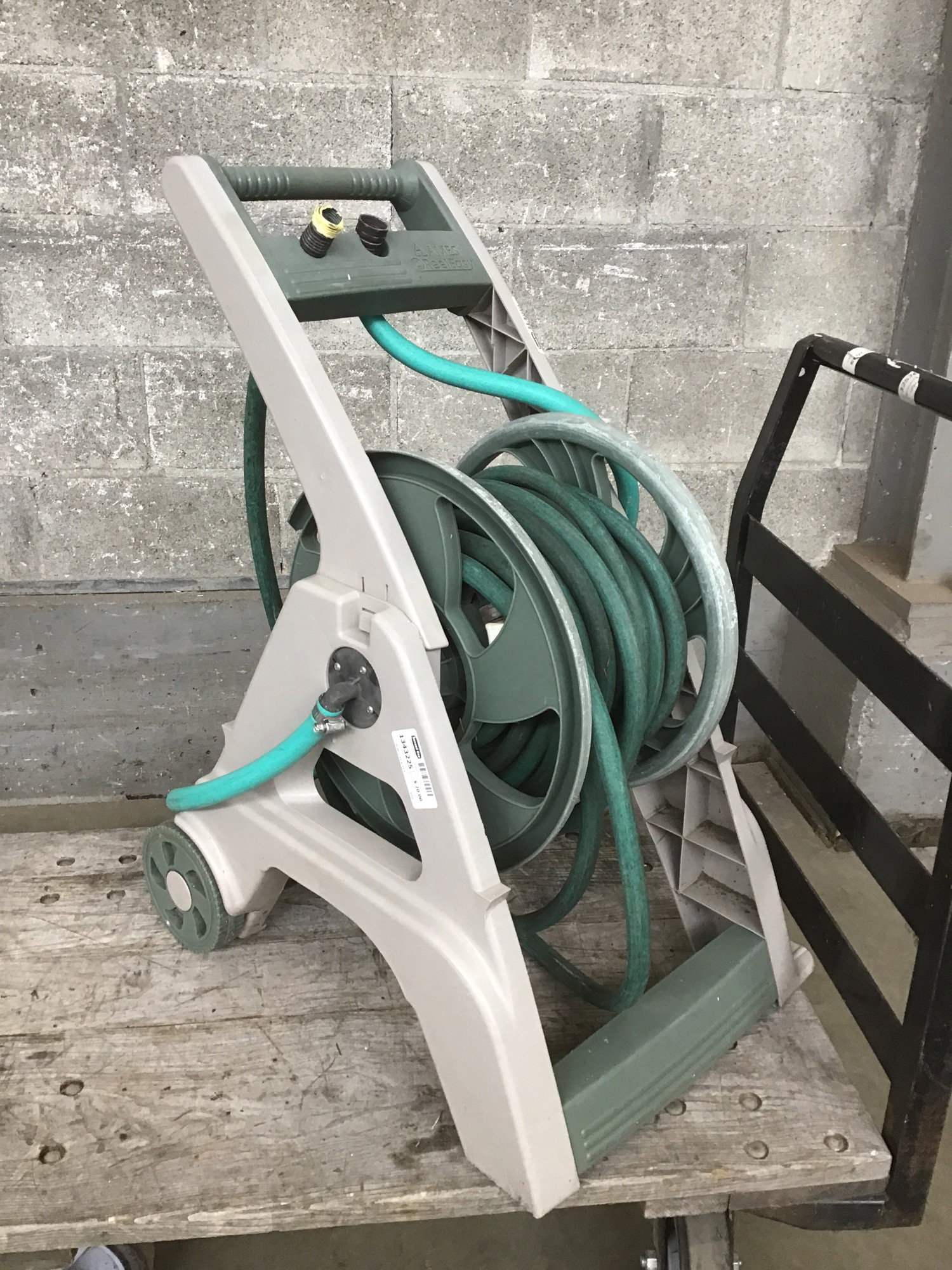 Heavyish plastic hose reel made by Ames. Has a hose on it.