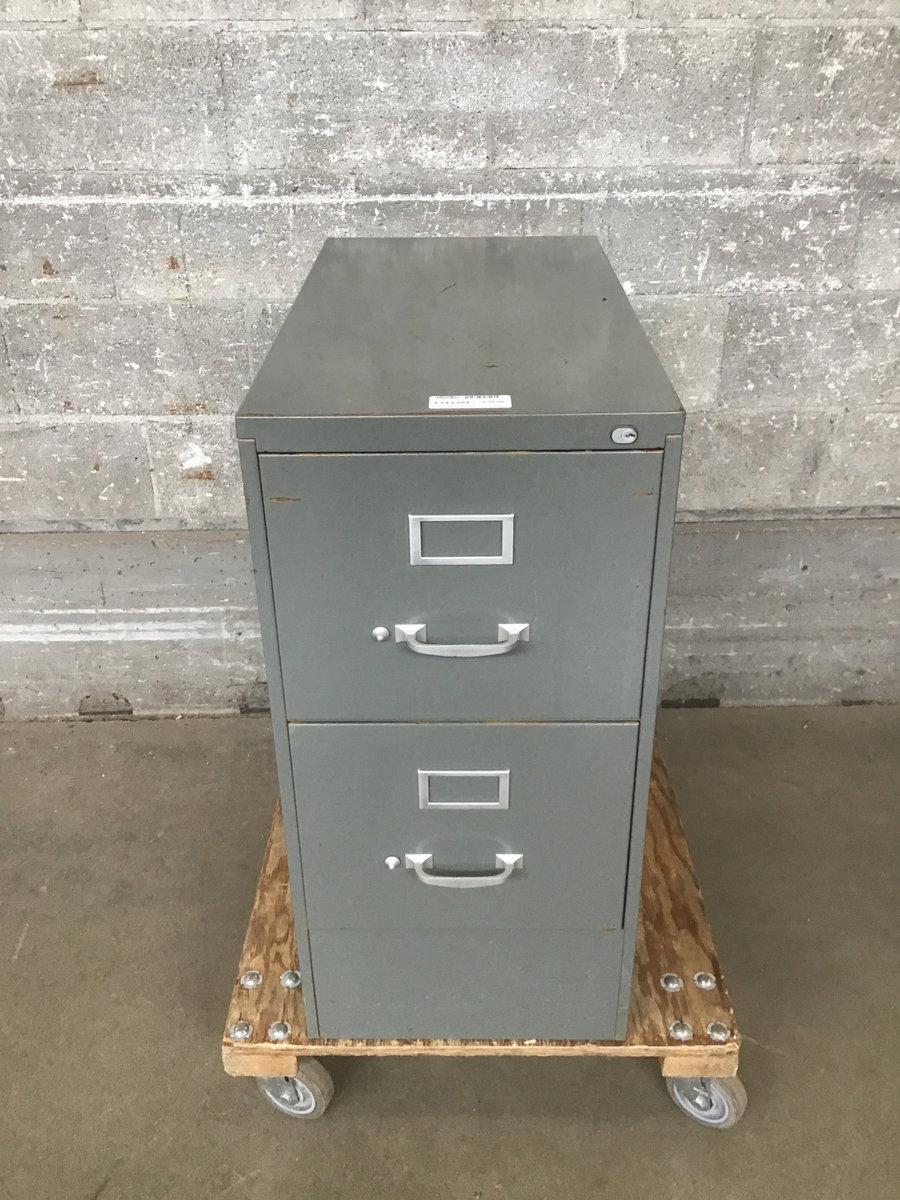 A small gray file cabinet with two drawers that looks to be in good shape. It has a lock, but unfortunately, we never got the key.