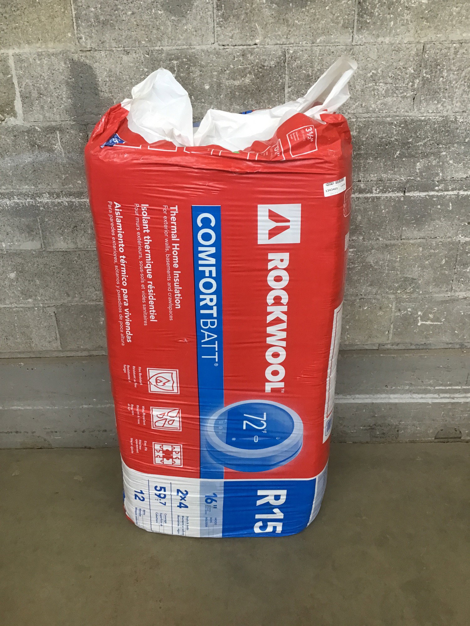 New package of R15 Rockwool insulation that will cover up to 59 square feet between twelve batts. Photo is representational. Retails new for about $80